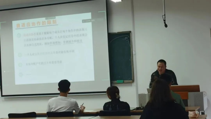 项知禹同学汇报的题目为“自适应协作”,他首先通过现实世界中人类工作时遇到的问题引出了自适应协作的基本知识,随后分享了自适应协作的基本符号和算法,并介绍了复杂的自适应协作的部分算法,如:基于角色潜力的自适应协作等,最后分享了论文中进行的实验,证明了自适应协作的稳定性和高效性。