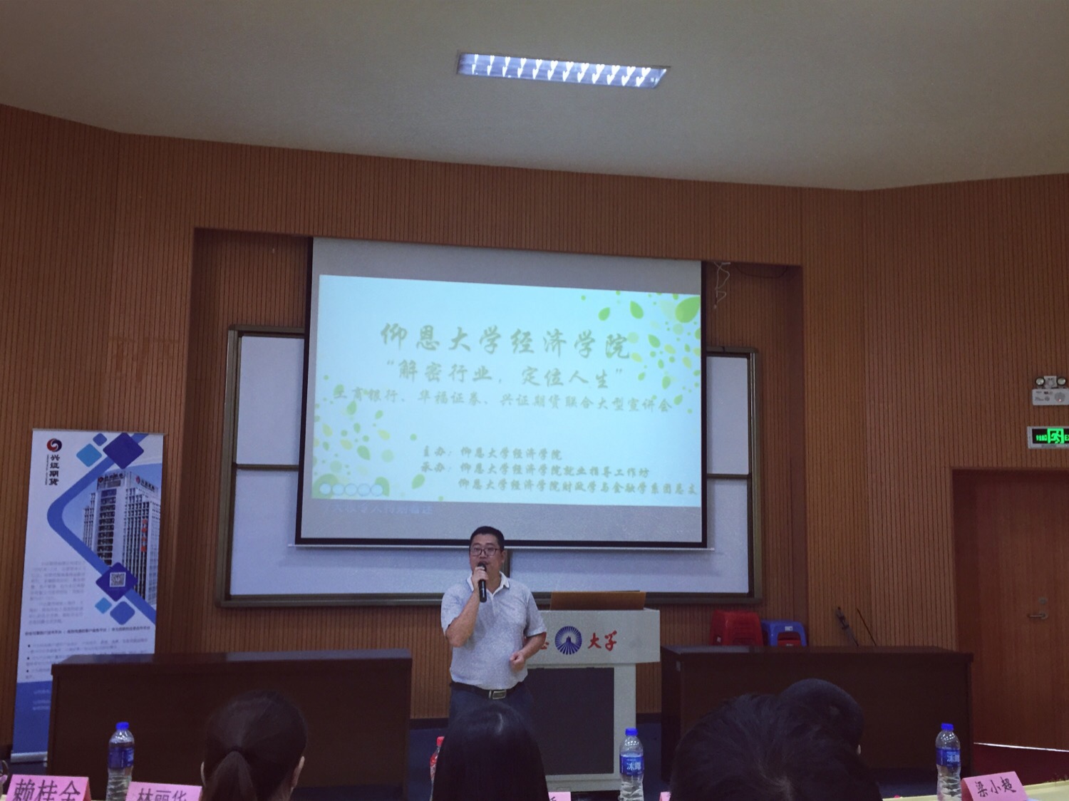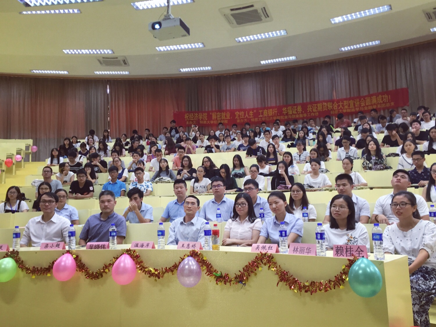 9月20日14点30分,“解密就业,定位人生”大型宣讲会在新区和昌楼惟勤讲堂举行。beat365官方网站党总支书记兼副院长吴晓伟、中国工商银行指挥巷支行副行长温海岸、beat365官方网站党总支副书记林丽华、beat365官方网站就业指导工作坊指导老师赖桂全出席,华福证券泉州湖心街营业部总监助理许振灵等嘉宾到场,beat365官方网站14、15级全体学生参加。