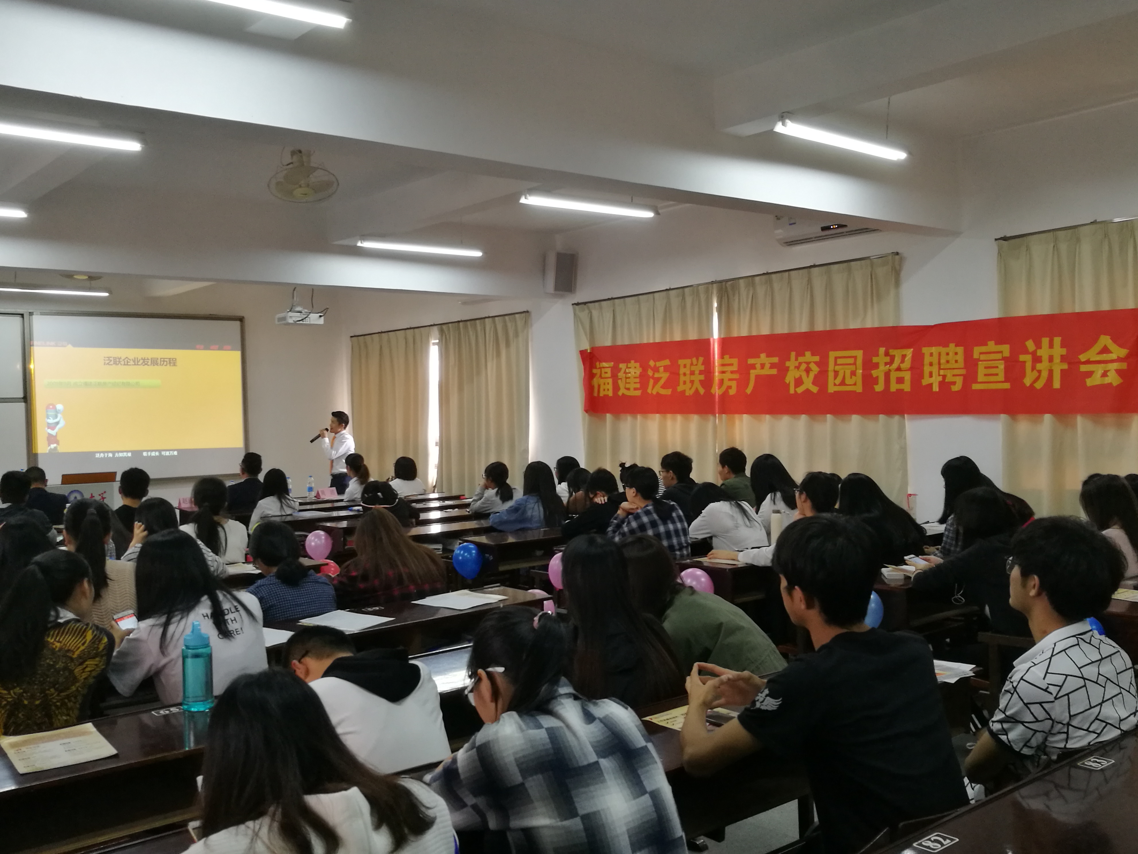 会上,宣讲会讲师赵淑浩与同学们分享了关于近年来房地产的发展趋势和市场前景,并介绍了泛联控股集团的现状和员工福利。期间,同学们积极与讲师互动,现场招聘活动有条不紊的进行着。