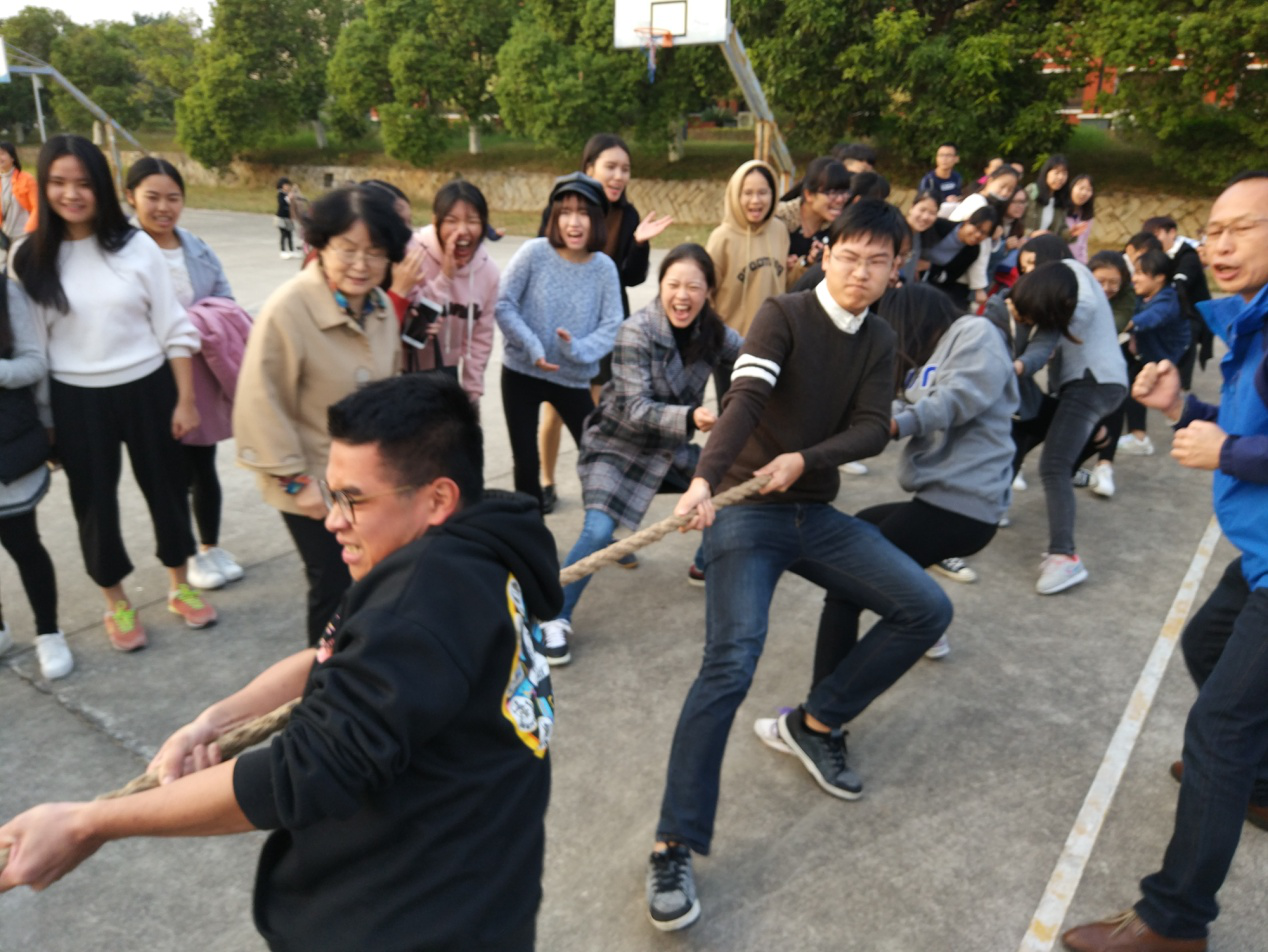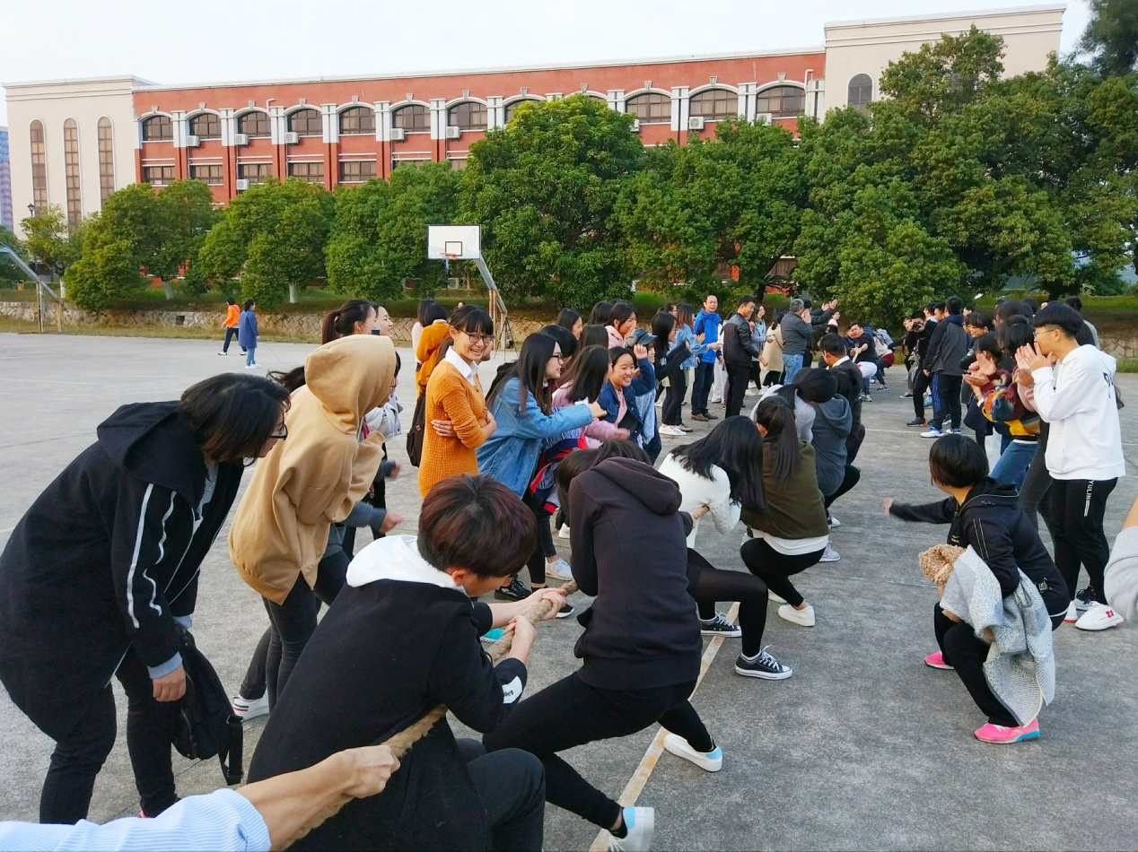 在3分钟十人八字跳的师生混合组队赛中,选手们轻快灵活,最终由发挥稳定的经济系队伍拔得头筹。最激动人心的当属师生PK赛的拔河的环节,观众们加油助威声此起彼伏,双方队伍卯足了劲,一鼓作气,咬紧牙关,拼尽全力,比赛一度趋于白热化状态。在三轮激烈比拼下,教师队伍获得胜利。趣味活动上,参赛老师与学生在比赛中使出“十八般武艺”,而加油的队员们更是使出了浑身解数为参赛者呐喊助威,最终由经济系队伍获得五人六足、无敌风火轮第一名,教职工队伍赢得篮球比赛。在欢声笑语中,此次趣味运动会落下帷幕。