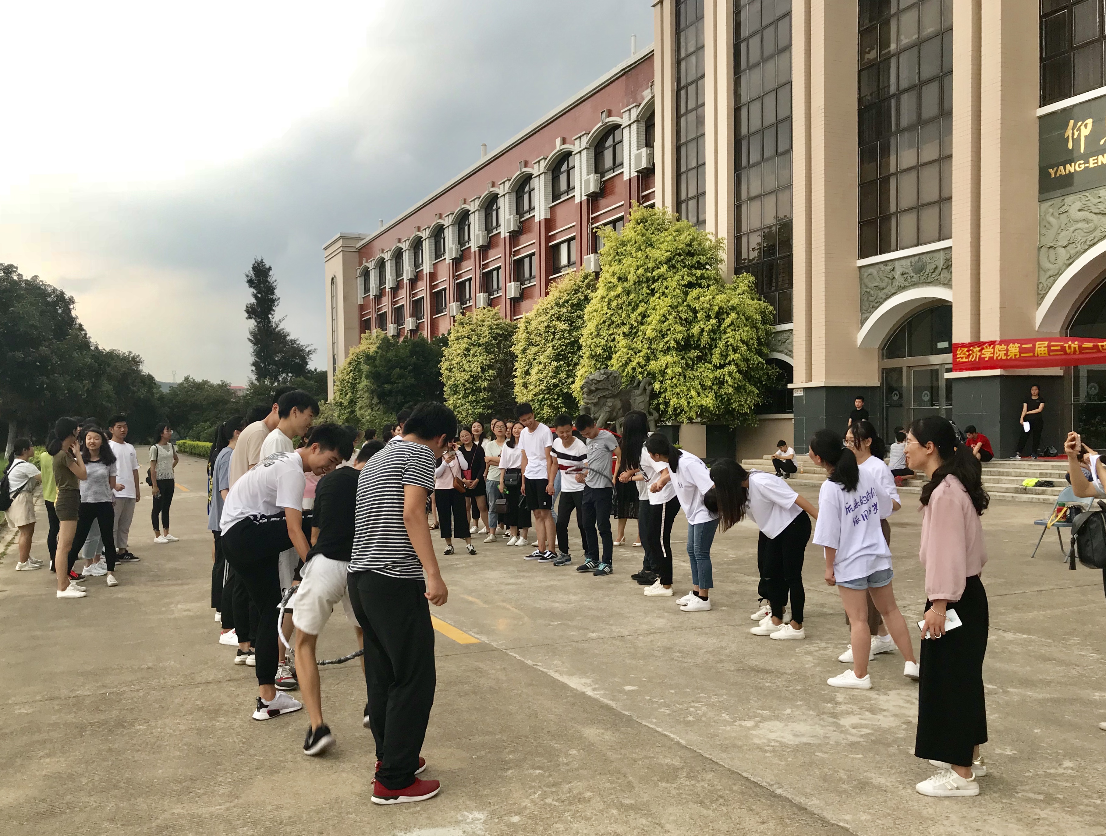 尽管烈日炎炎,现场人头攒动情绪高涨,各支队伍皆跃跃欲试,充分做足热身准备,争分夺秒练习比赛项目。在50米迎面接力赛中,选手们紧握接力棒,似离弦之箭向前冲刺,加油呐喊声此起彼伏,接力棒的交接牵引着全体观众的心。比赛过程中出现掉棒失误选手,其余队员不甘示弱,奋起直追。经过两个回合排名比赛,最终由用时最短的经济系取得项目第一。五人六足、趣味接力赛、穿越呼啦圈项目则考验师生协作默契。赛前,参赛选手摩拳擦掌,寻找加快速度、保持平衡的方法。比赛现场热烈激昂,加油声如潮水般一浪高过一浪,各支队伍精神抖擞,紧密配合,团结协作,奋勇争先。经过激烈的比赛后,师生欢声笑语其乐融融,于仰恩楼正门合照留念。