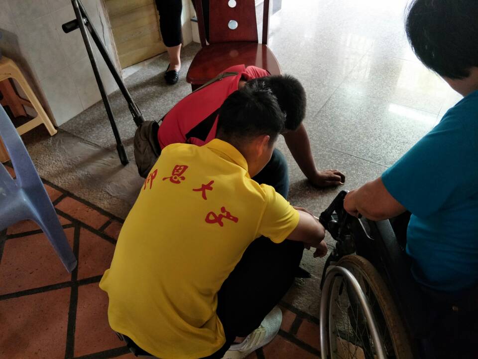 (图为实践队员与同行残友帮助另一残友)