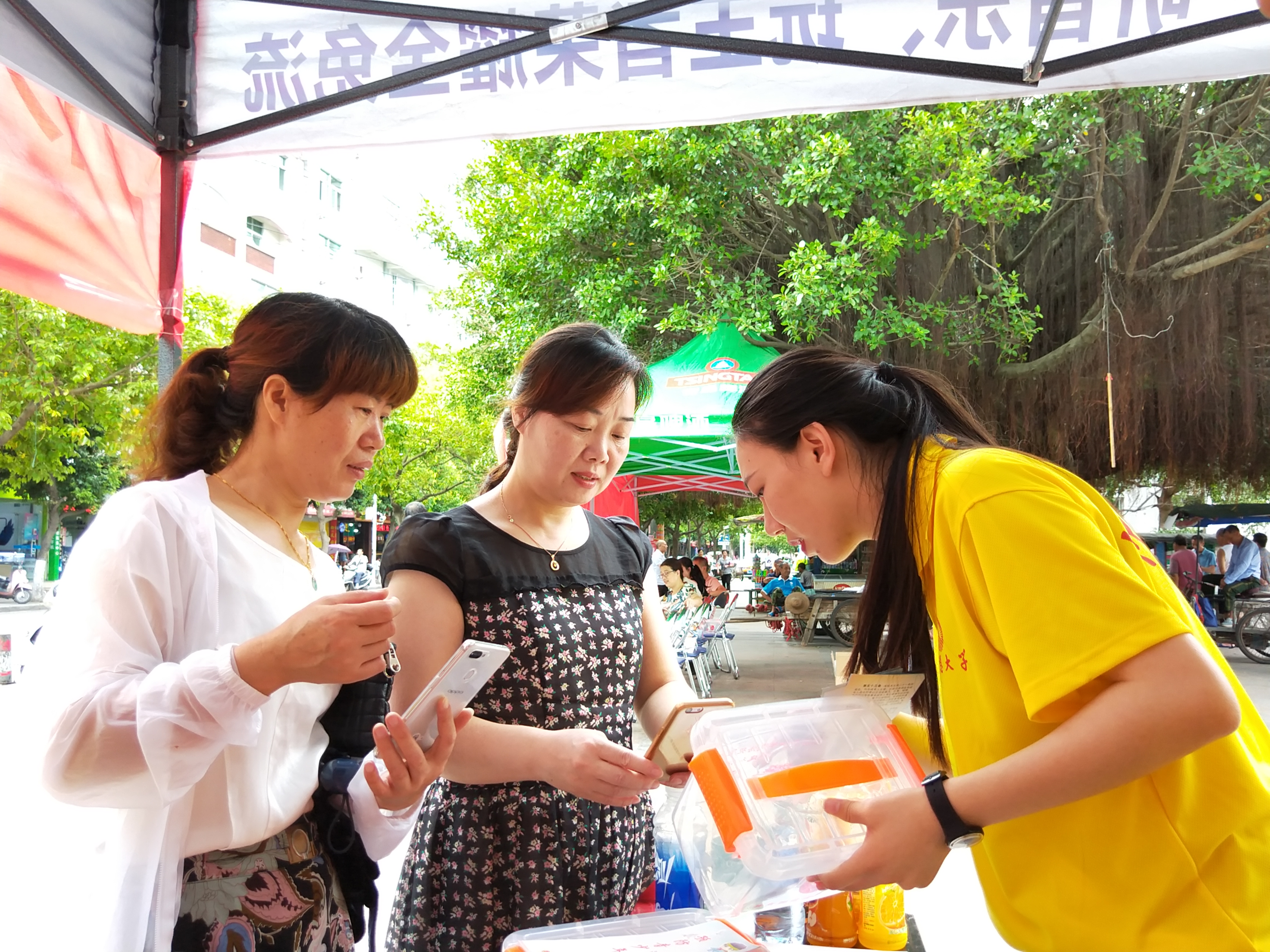 在文化广场上设立服务站,分发宣传册和禁毒宣传的纪念品。实践队伍分为两个部分,8名实践队员到街上分发宣传册,另外8名队员在站点进行讲解禁毒内容和分发纪念品。在领取禁毒纪念品前,需要领取人扫码关注共青团霞浦县委员会,了解更多禁毒知识,让霞浦人民参与到禁毒工作。与此同时,共青团县委也安排了宁德师范学院绿色环保何小禹暑期实践队在此地宣传保护水资源。在此期间,两支队伍进行了禁毒知识与保护水资源的内容交流以及分享实践的经验,并互相鼓励,合影留恋。