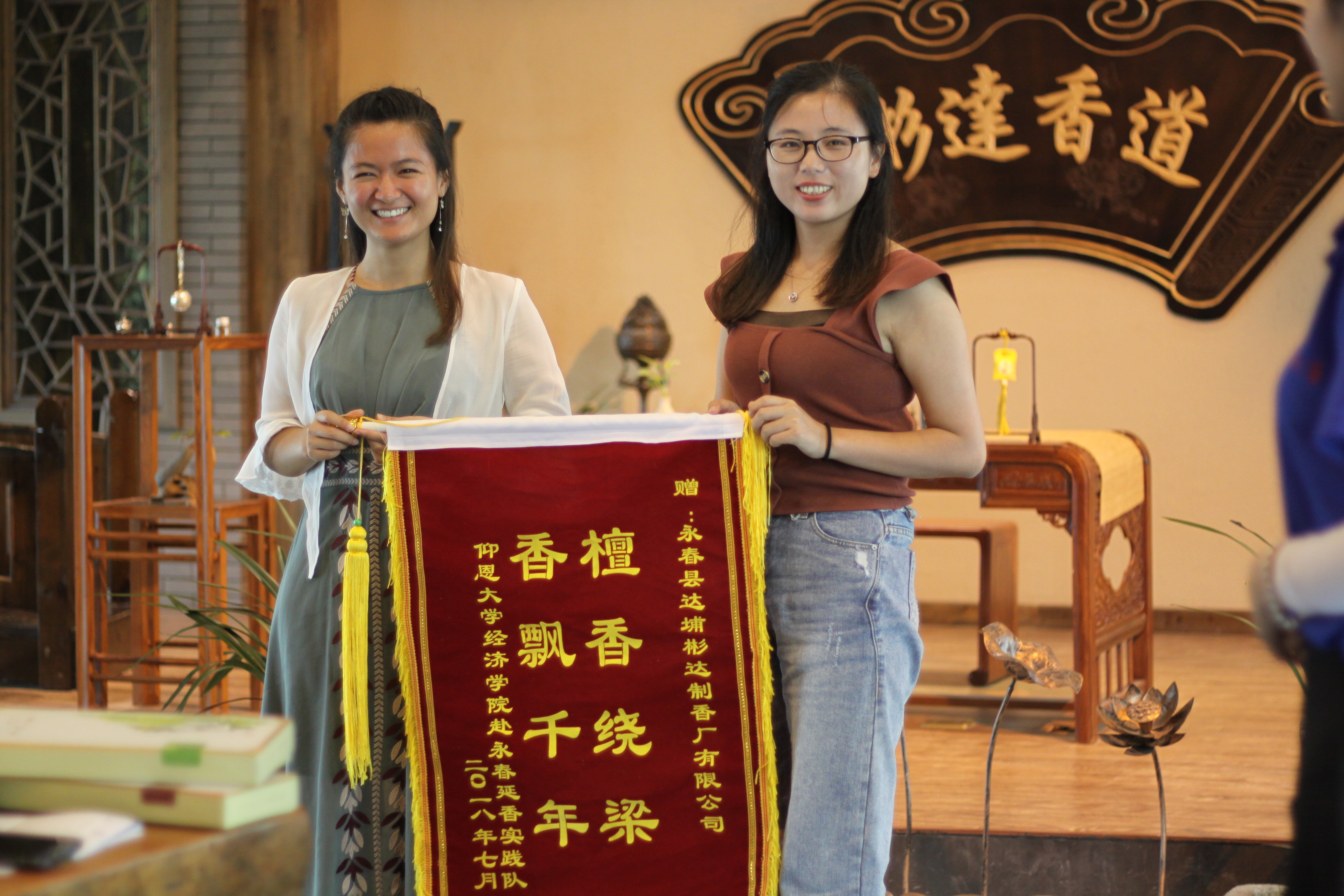 此外,曾小姐还给实践队员们展示了彬达公司的产品,分享了鉴别香的优劣的方法。同时,她也指出了当前制约永春香产业发展的瓶颈。一是人才资源的不足,二是制香设备的突破和创新。可喜的是,当地政府已经出台了多项有利于香产业发展的政策和措施,积极引进技术,鼓励高技术人才和当地大学生回乡发展香产业。活动的最后,赖桂全老师送上锦旗,并感谢彬达公司对实践队的大力支持。