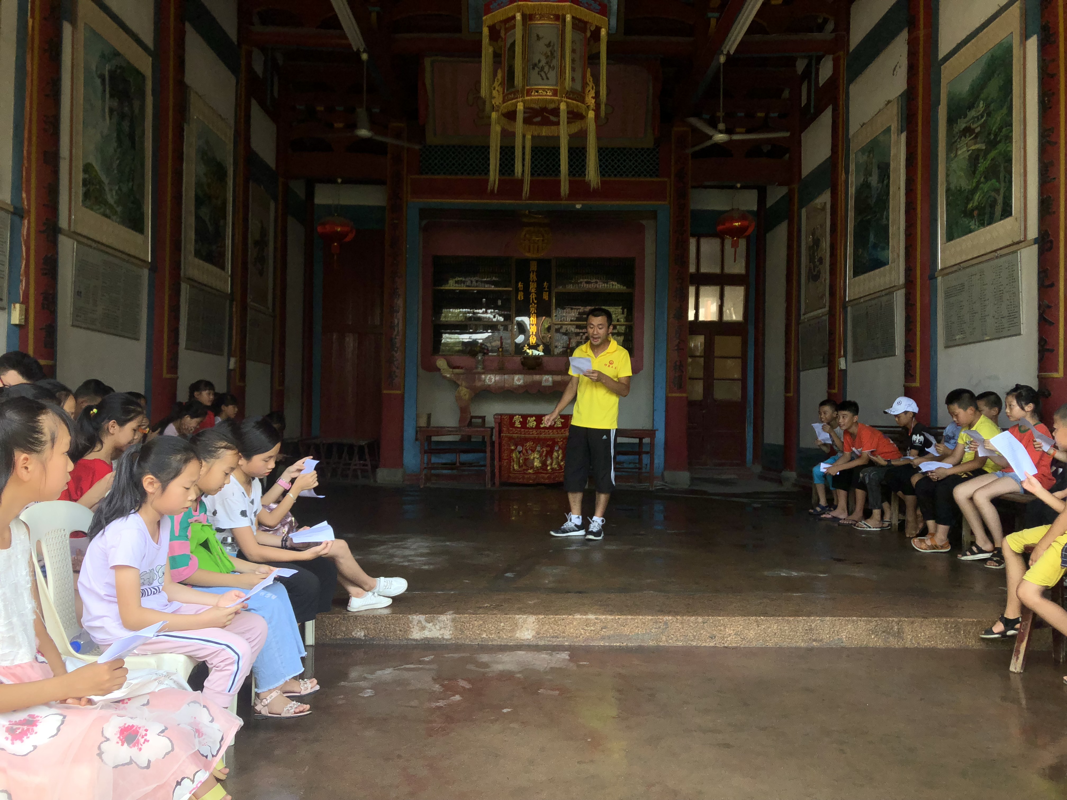 实践队兵分两路,一路的队员们为在图书馆的小学生们进行诗歌《海燕》的指导。队员们早早就为此次支教做了准备,事先参透文章主旨及内涵。教学过程中,从纠正咬字发音,到字句间的断句和抑扬顿挫,再到情感的注入与升华,每个细节实践队员皆悉心教导、耐心讲解。另一路的队员们则来到林家祠堂,带领小学生们合唱《苔》。洪森原指导老师亲临现场,并带来专业性的指导意见。现场气氛融洽,欢笑声不断。