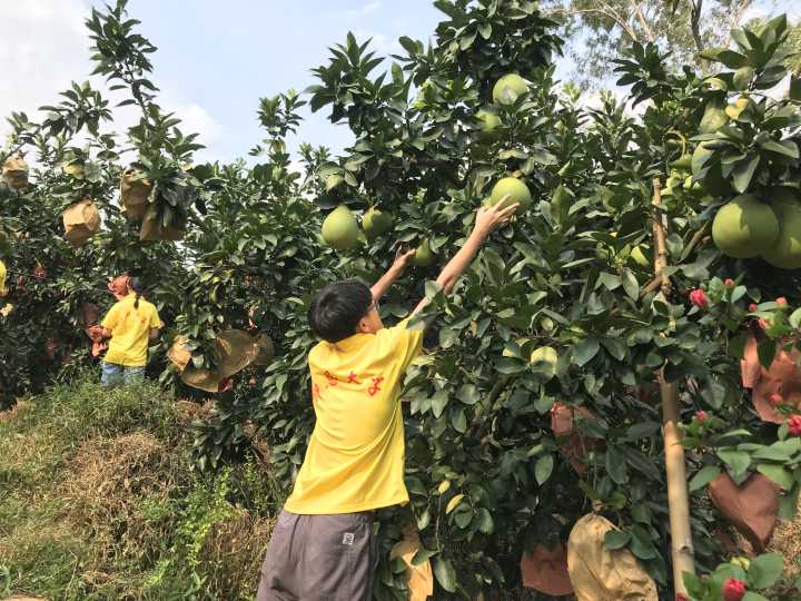 刚到蜜柚园,实践队员仔细观察了蜜柚的形状大小,以及周围的生长环境。队员发现地上长着杂草,农民解释,果园生草有利于增加病虫天敌的种类和数量,以此保护柚树的生长。队员们还了解到了红蜘蛛是危害蜜柚的病虫之一,过去主要靠打药来防治虫害,现在主要靠其天敌来防红蜘蛛。最后,为让当地的农民对种植蜜柚的知识有系统性的了解,队员们将一本蜜柚种植书籍赠送给当地居民,希望能对农民的种植有一定的帮助。