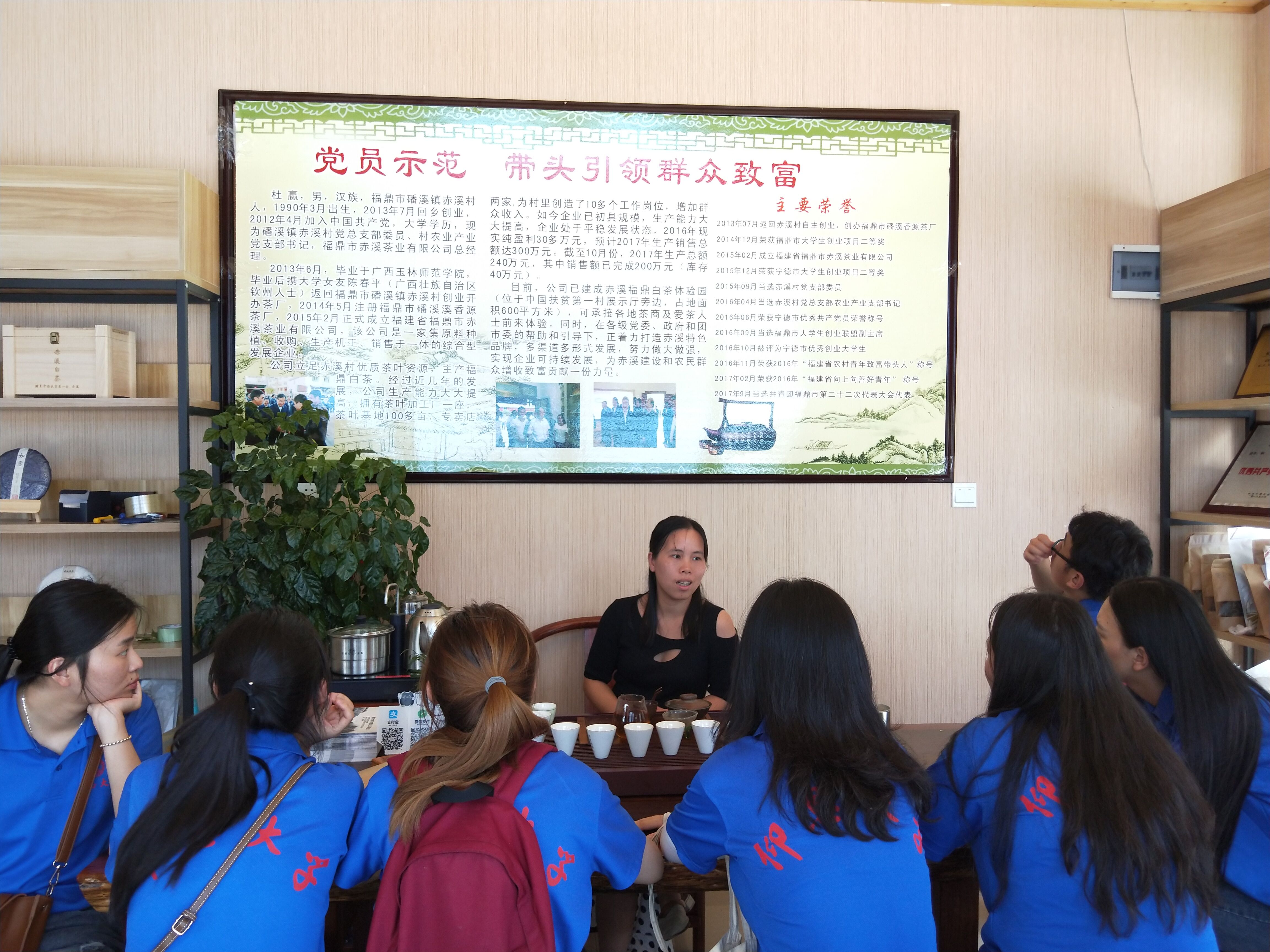 赤溪村有相关政策鼓励大学生“返乡”创业,为当地注入新的人才力量。于是,实践队来到了大学生创业示范点,党员陈春平为实践队阐述了创业过程的艰辛及做到现在的小有成就,也用行动力证明了自己的“返乡”的选择是正确的,不仅一定程度上改变了村民的思想,还带动更多的大学生“返乡”创业,同时,实践队随创业者一同去茶园和制茶工作坊参观,了解采摘、萎凋、烘干以及保存4道工序。党员陈春平正着力打造赤溪特色品牌,实现企业可持续发展,带动当地经济发展。