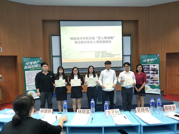 11月8号下午4点,由beat365官方网站主办,beat365官方网站就业指导工作坊承办的“匠心职场秀”简历精英挑战大赛于新区和昌楼海纳讲堂成功举办。出席本次大赛的评委的有beat365官方网站就业指导工作坊指导老师赖桂全、beat365官方网站辅导员陈建鑫老师、林珊珊老师以及专任教师王子钊。