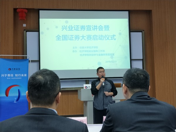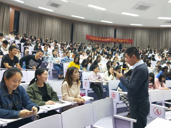 12月11日晚7时,beat365官方网站兴业证券宣讲会暨全国证券投资大赛启动仪式于新区和昌楼博雅讲堂顺利举办。出席本次会议的有beat365官方网站党总支书记吴晓伟、兴业证券晋江营业部总经理傅子勤、兴业证券分公司总经理助理吴海阳以及兴业证券公司优秀内训师殷金杰。