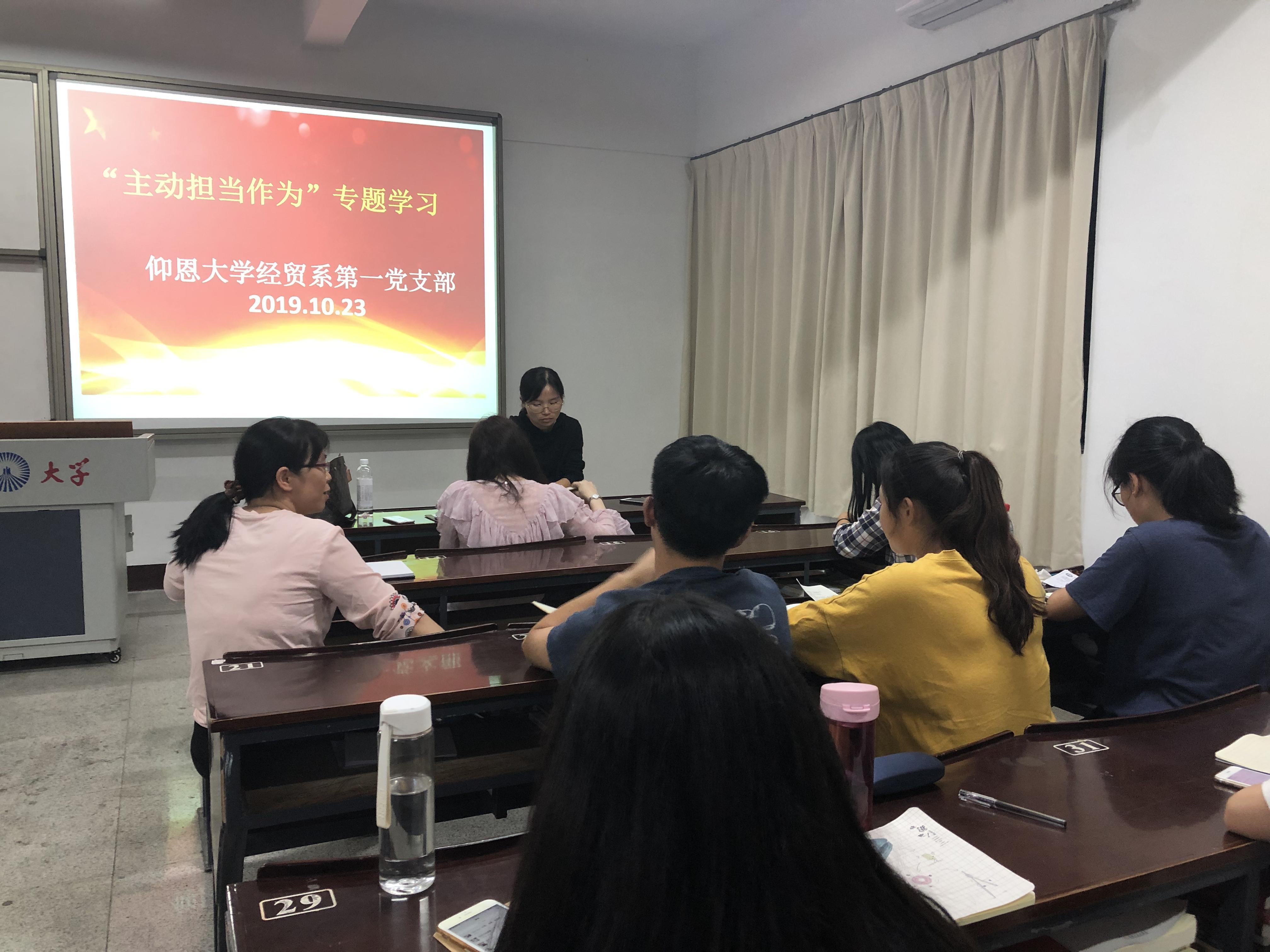 10月23日,经贸系学生第一党支部于仰恩楼A1-109召开“主动担当作为”专题学习会,支部书记林丽华、组织委员吴惠明、宣传委员邹琴及全体支部党员出席本次会议。