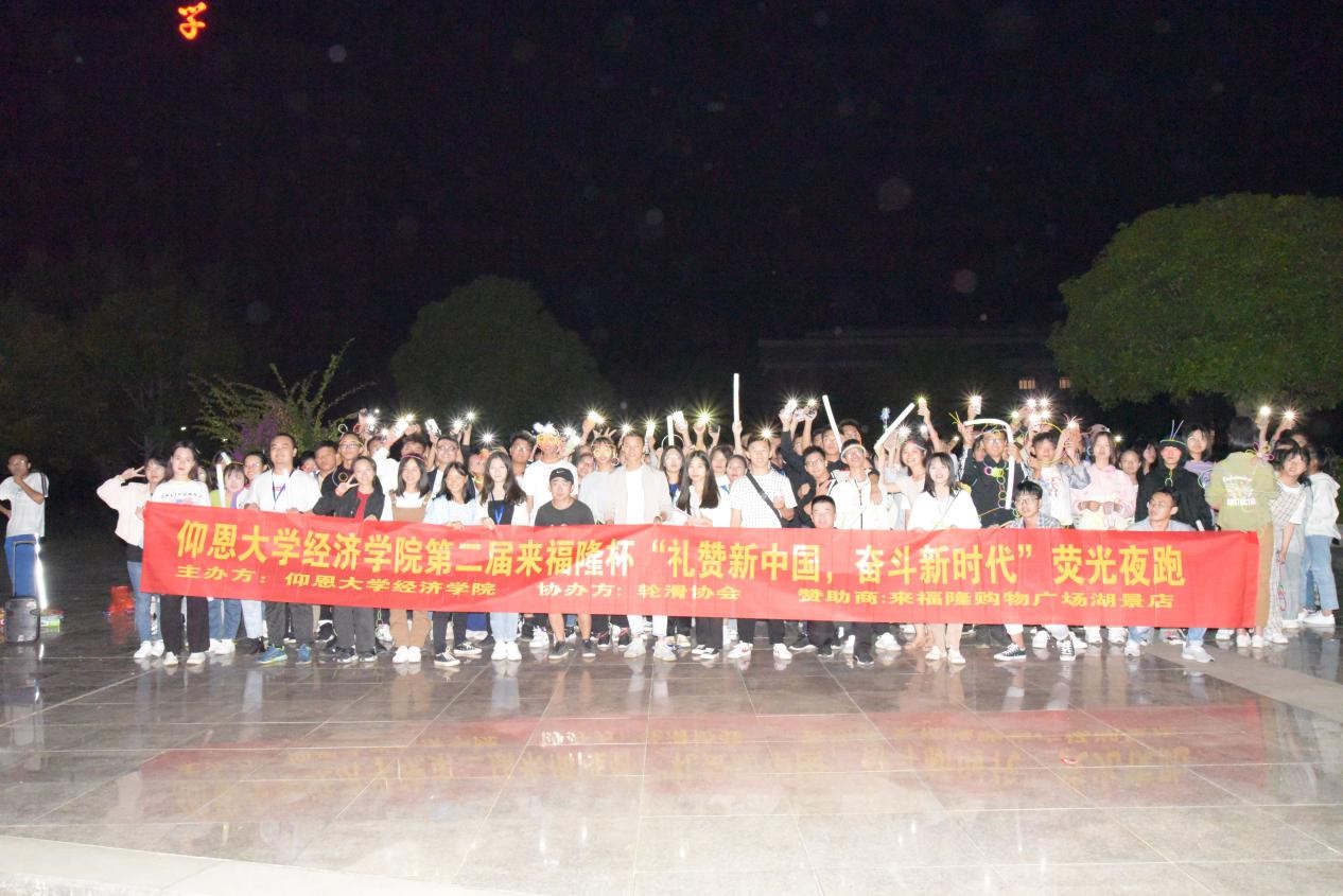(集体合影留念) 此次“荧光夜跑”活动,经院学子以高涨的热情展现了新中国青年的风采,在今后的学习生活中将以昂扬的姿态为祖国的新时代不断奋斗。(beat365官方网站新闻中心/文 beat365官方网站团委宣传部/图)