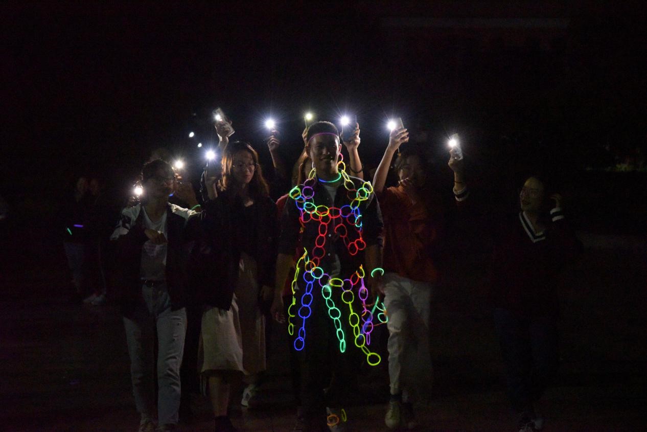活动共有五个环节,分别是“我是新青年,礼赞新中国”签名活动、荧光环校跑、荧光节目秀、游戏大比拼、荧光创意时装秀。在荧光环校跑环节,同学们佩戴五颜六色的手环,从无字碑广场出环绕图书馆进行荧光跑,展示出了当代青年积极向上的青春活力。在最后的荧光创意时装秀中,同学们利用荧光棒装饰自己并以T台秀形式展示自己的作品,创意迭出精彩纷呈,活动在同学们热烈的欢呼声中落下帷幕。