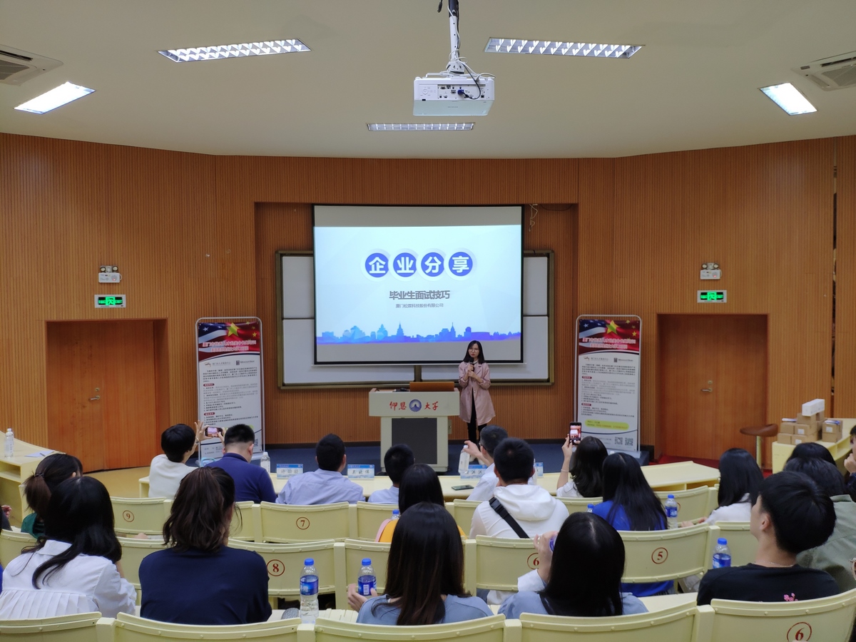 厦门高新人才有限公司总经理赖洪洪为同学们全面分析了厦门的概况、产业信息以及人才需求。通过讲解近年来出现各个城市和企业“人才大战”的现象,鼓励同学们在做出准确自我定位的同时,及时关注政策的变化。随后厦门松霖股份有限公司人事经理王惠玉为同学们讲解有关面试技巧,王惠玉结合公司人才招聘视频强调要针对应聘岗位来突出自己的优势,鼓励大家找准自己的就业方向,提升综合能力。