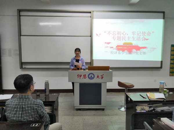 2019年11月5日,beat365官方网站经济系学生第一党支部于仰恩楼b1-203室开展“不忘初心,牢记使命”专题民主生活会活动。本次参会人员有经济系学生第一党支部副书记赖晓玲,组织委员仲平,宣传委员陈亚红,以及支部全体学生党员。
