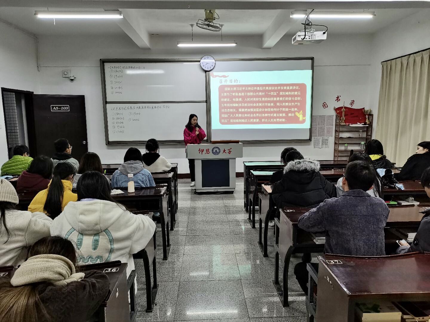 本次会议以“增强信心,迎难而上”为主题,要求支部积极分子通过分享对“习近平总书记在基层代表座谈会上重要讲话”的理解,树立正确的理想信念。会议中,各班积极分子代表通过PPT、视频等方式分享了自己的学习心得与理解,纷纷表示要志存高远、脚踏实地,为社会传递正能量,勇于担当这个时代赋予的历史责任。最后,组织委员何丽玲进行了总结发言,她指出,中国社会主义发展到今天,靠的是中华民族的团结一致众志成城,每位同学都应坚定理想信念,注重学习提升,从点滴小事做起,靠勤劳的双手成就属于自己的精彩人生。
