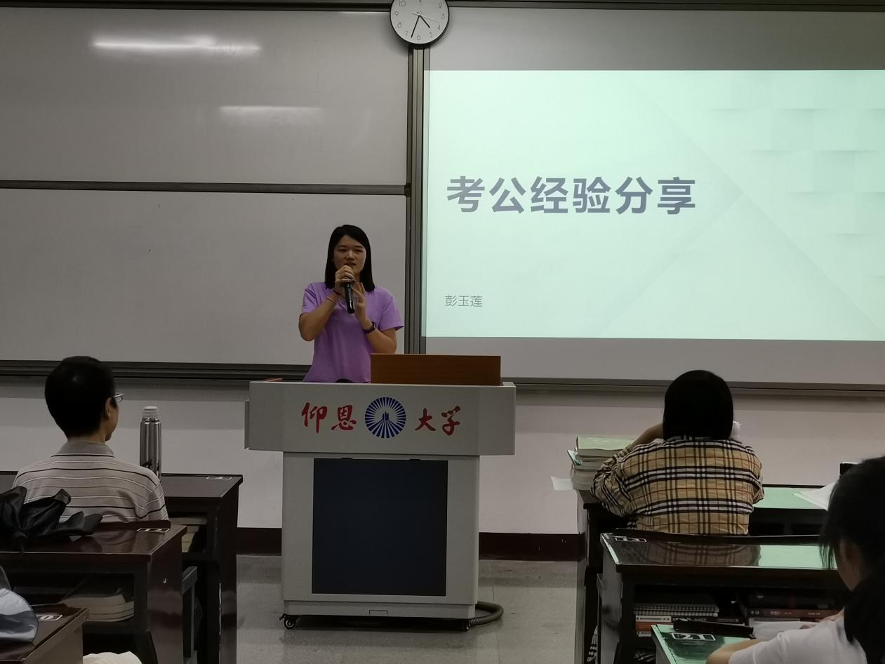 分享会开始,彭玉莲同学详细介绍了考取教资、选调、国考等考试的区别,介绍了公务员考试的条件、要求以及相关的准备工作,并结合自身经历解答了在校大学生在大学生活中应如何明确目标、调整自身心态以及提升自身能力等问题。随后,雷湘同学分享了自身备考银行的经验以及在银行实习的相关经历,向大家提出如何合理安排学习时间及相关考试的建议。