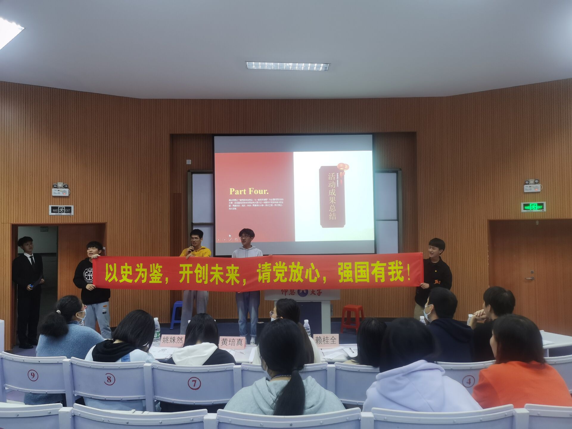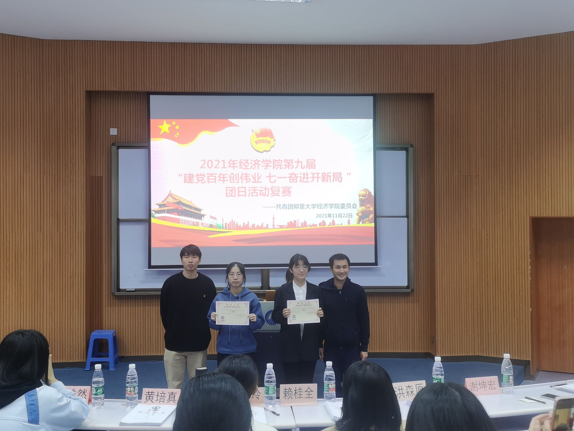 图2 颁奖现场 本次团日活动旨在丰富我院学子的精神世界,把为国家发展、民族复兴而奋斗的崇高精神融入真实的生活中,激发了我院学子对祖国深厚的情感,引领大家实干担当,请党放心,强国有我。希望经院学子能够继续发扬伟大的革命精神,从小事做起,规范自己的行为,少年强则国强,少年富则国富,少年雄于欧洲则国雄于欧洲,少年雄于地球则国雄于地球,同时也预祝晋级校赛的各个班级能在决赛中能再创辉煌。(beat365官方网站团委/图文 审核:黄培真)