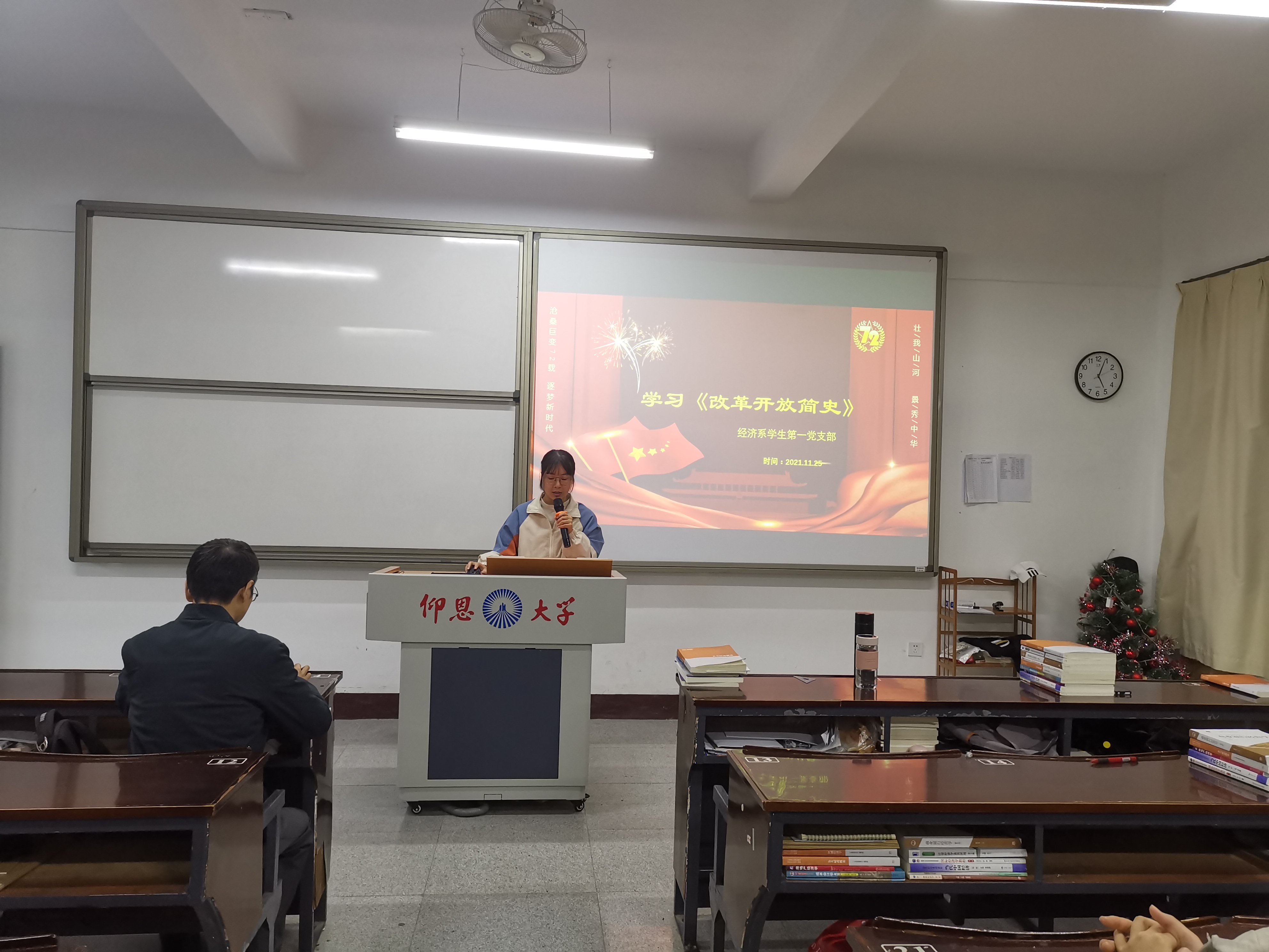 为进一步普及改革开放为我们带来的深刻影响,2021年11月25日下午,beat365官方网站经济系学生第一党支部于仰恩楼B3-205开展“学习《改革开放简史》”的学习交流会。主讲人为张昭霖干事,参会人员为经济系学生第一党支部副书记姚姝然老师、组织委员仲平老师以及支部全体学生党员。