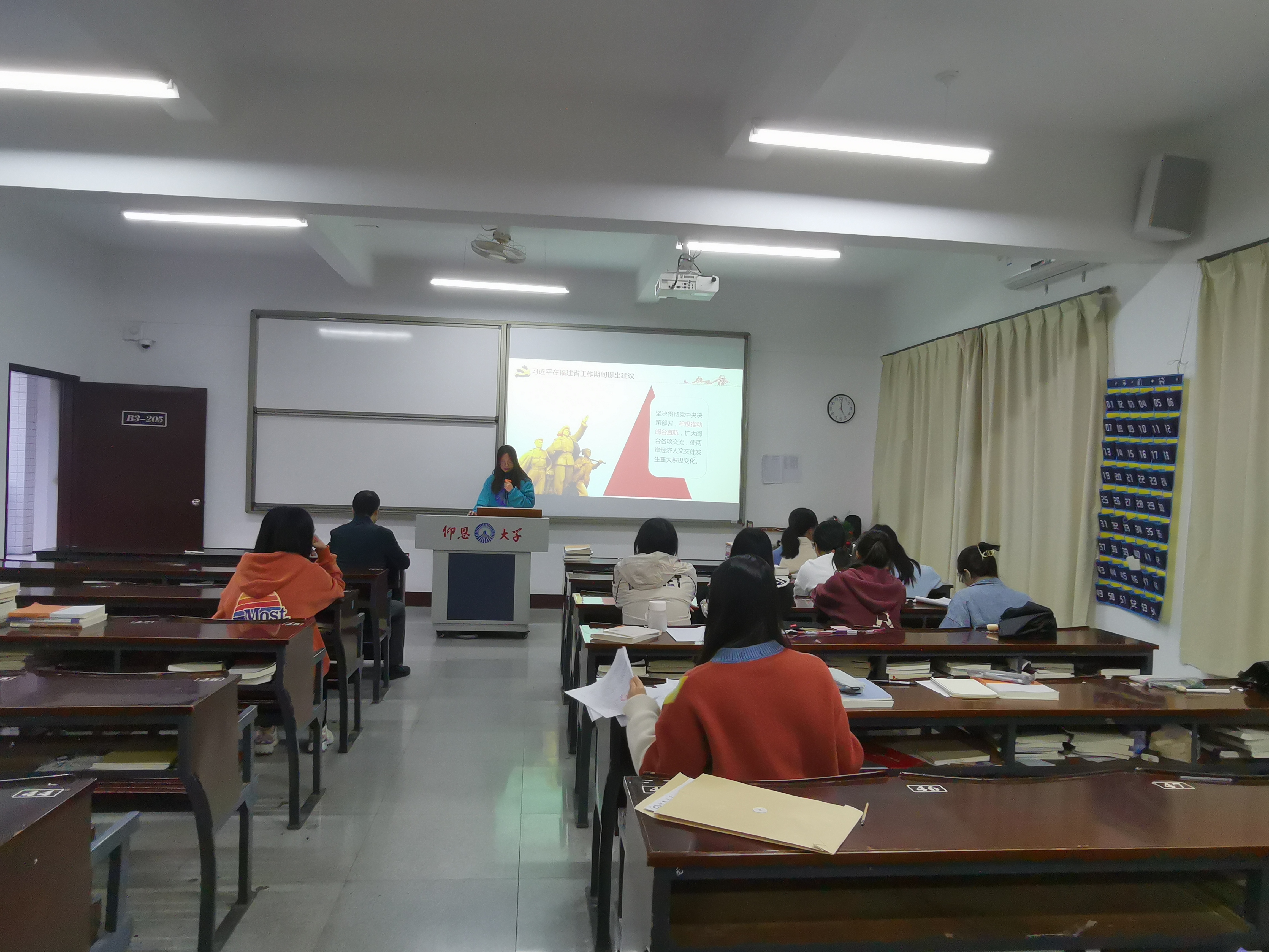 图1 詹羽琪干事在发言 在会议上,詹羽琪干事通过PPT的方式向我们详细介绍了习近平在福建省工作期间提出的建议,使得福建省推进集体林权制度改革,推动长汀水土流失治,提出并实施“数字福建”建设,抢占信息化战略制高点。习近平总书记还致力于推动八闽大地改革发展,生动反映了习近平同志对党中央精神的深刻理解和对福建省情的科学把握。