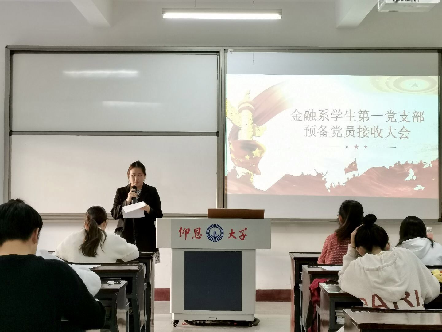 为响应党的号召,扩大党员队伍,2021年12月9日下午3:55,beat365官方网站金融系学生第一党支部在仰恩楼B5-203召开预备党员接收大会。本次大会参会人员有支部书记何丽玲老师、组织委员谢坤宏老师和宣传委员詹奕椿老师,以及支部全体学生党员,还有即将成为预备党员的30名发展对象。