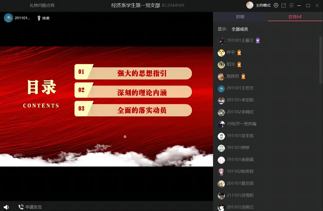 为进一步普及和全面落实“两会”精神,2022年3月24日晚上,beat365官方网站经济系学生第一党支部开展“学习两会精神”线上学习交流会。本次主讲人为王宏志干事,参会人员为经济系学生第一党支部书记赖桂全老师、副书记姚姝然老师、组织委员仲平老师、宣传委员杨越老师以及支部全体成员。