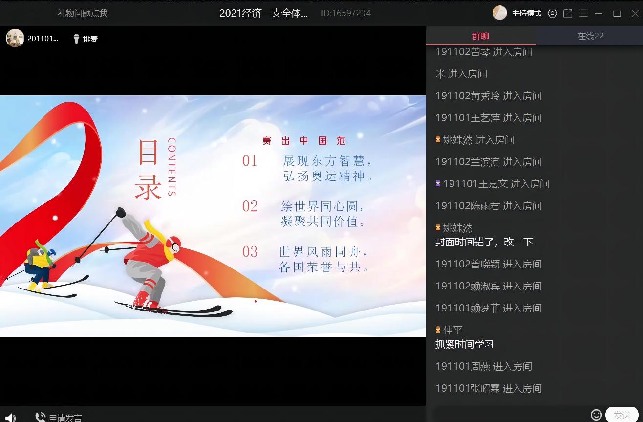 为进一步加强支部全体党员的国事教育,根据经济系学生第一党支部的工作安排,3月24日晚,经济系学生第一党支部在线上开展《冬奥,打开中国新格局》主题党日活动。学习会由支部干事詹羽琪主持,经济系学生第一党支部书记赖桂全老师、副书记姚姝然老师、组织委员仲平老师、宣传委员杨越老师以及支部全体学生党员参与会议。