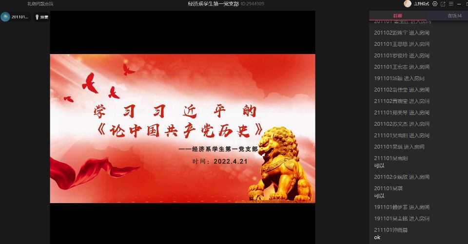 为引导广大党员进一步坚定理想信念,做到知史爱党、知史爱国。4月21日,经济系学生第一党支部在线上举行学习习近平的《论中国共产党历史》学习会。经济系学生第一党支部书记赖桂全老师、副书记姚姝然老师、组织委员仲平老师、宣传委员杨越老师,以及全体学生党员和入党积极分子参加会议。