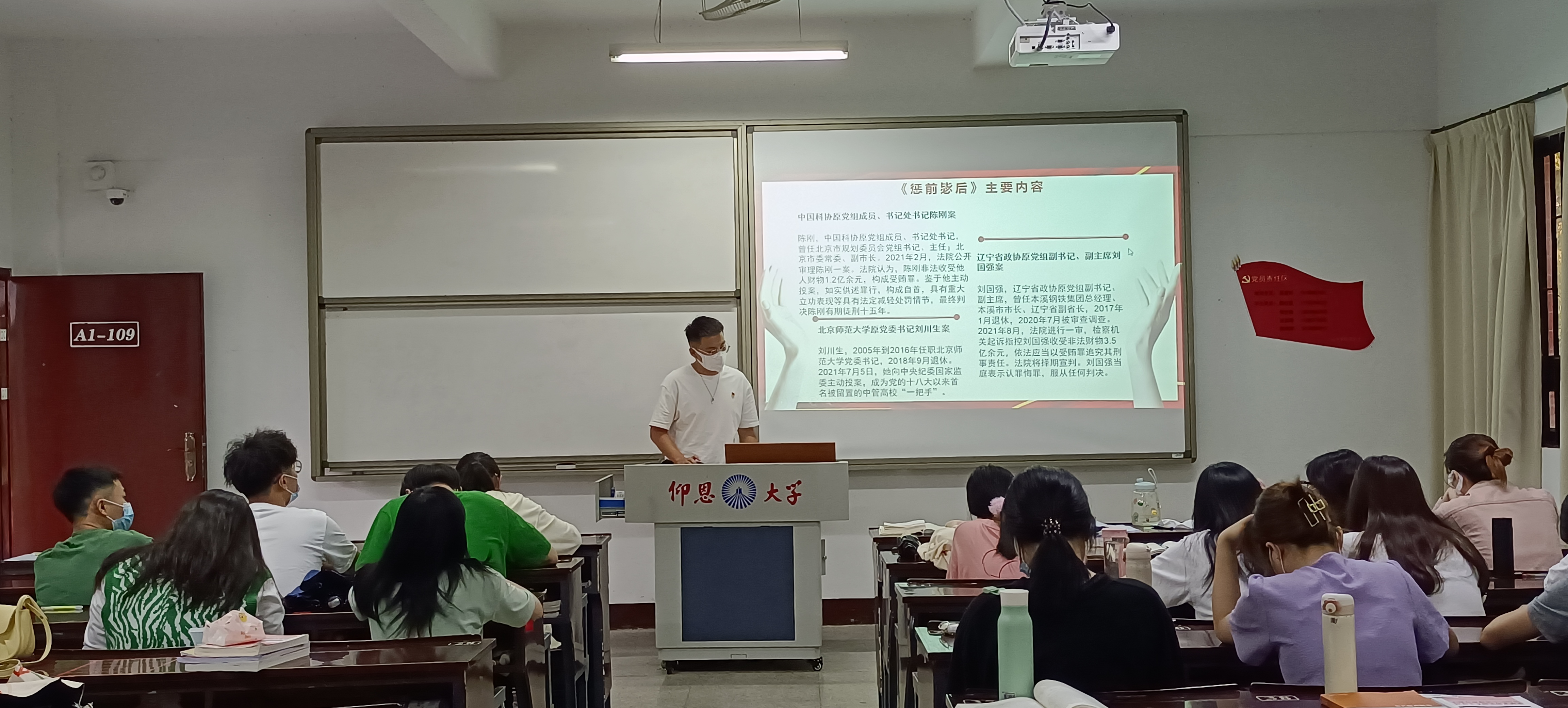 为了让支部全体同志加强党性修养,保持和发扬党的优良传统作风,使廉洁自律规范内化于心、外化于行,坚持理想信念宗旨的“高线”、严守党规党纪“底线”。2022年5月23日下午4点30分,经贸系学生第一党支部在仰恩楼A1-109开展“讲党性,守党规,严党纪”书记好党课。经贸系学生第一党支部书记黄培真老师、全体学生党员,以及入党积极分子参加了此次活动。