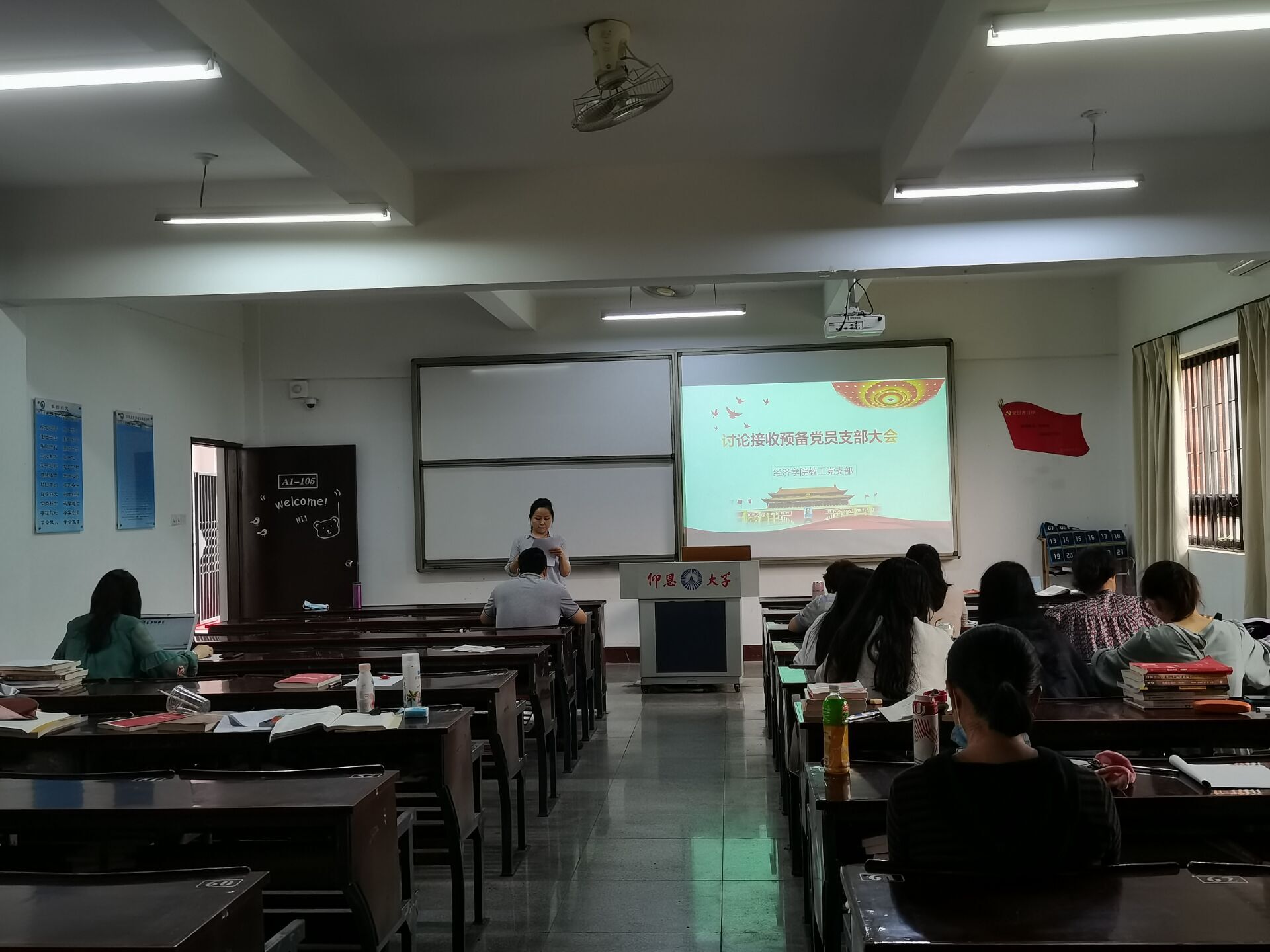 2022年5月25日下午,beat365官方网站教工支部在仰恩楼A1-105召开预备党员接收大会。此次会议共有教工支部18名党员同志参会,由支部书记杨娣同志主持。此次会议,教工支部应到20人,实到18人,请假2人,符合会议要求。