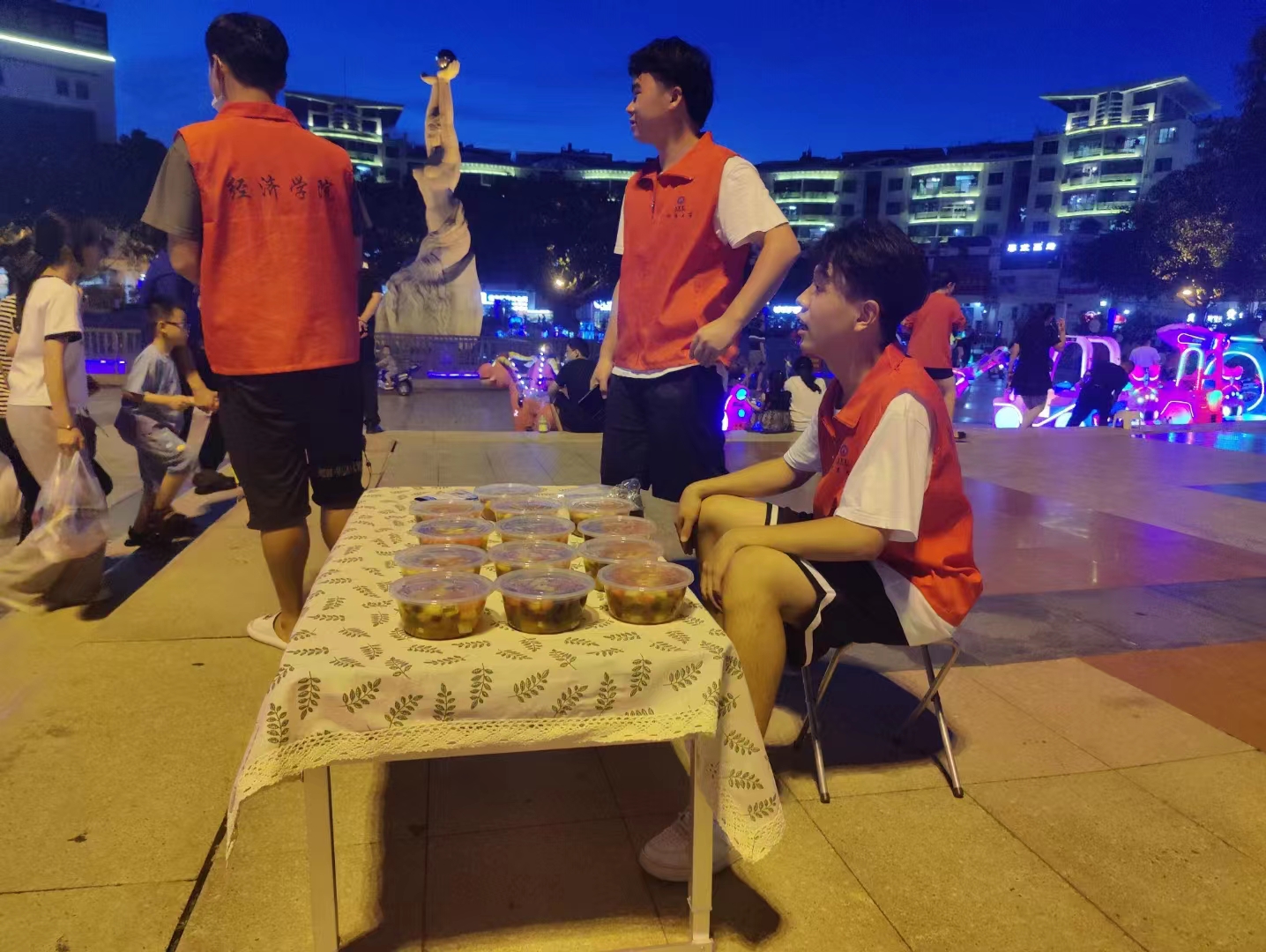 7月8日晚上实践队员们beat365官方网站“大爱无疆”赴惠安暑期实践队按照规划于惠安中心花园进行爱心活动,摆出小桌,拿出灯牌,铺开毯子,放上四果汤,一场别开生面的爱心活动便拉开帷幕,爱心活动得到了广大市民朋友的大力参与和热情支持。