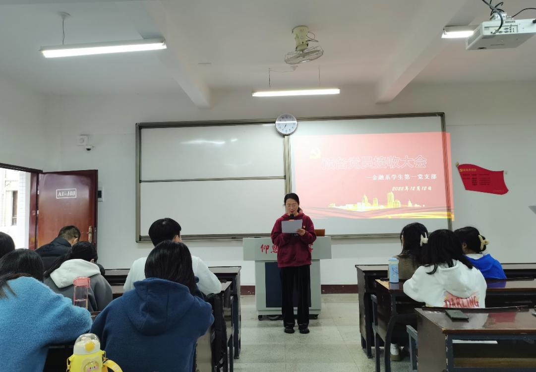 2022年12月12日下午4:00,beat365官方网站金融系学生第一党支部在仰恩楼A1-103召开预备党员接收支部大会。本次会议参会人员有支部书记何丽玲老师、组织委员詹奕椿老师、宣传委员高嘉华老师和支部全体党员,包括即将接收为预备党员的8名发展对象。