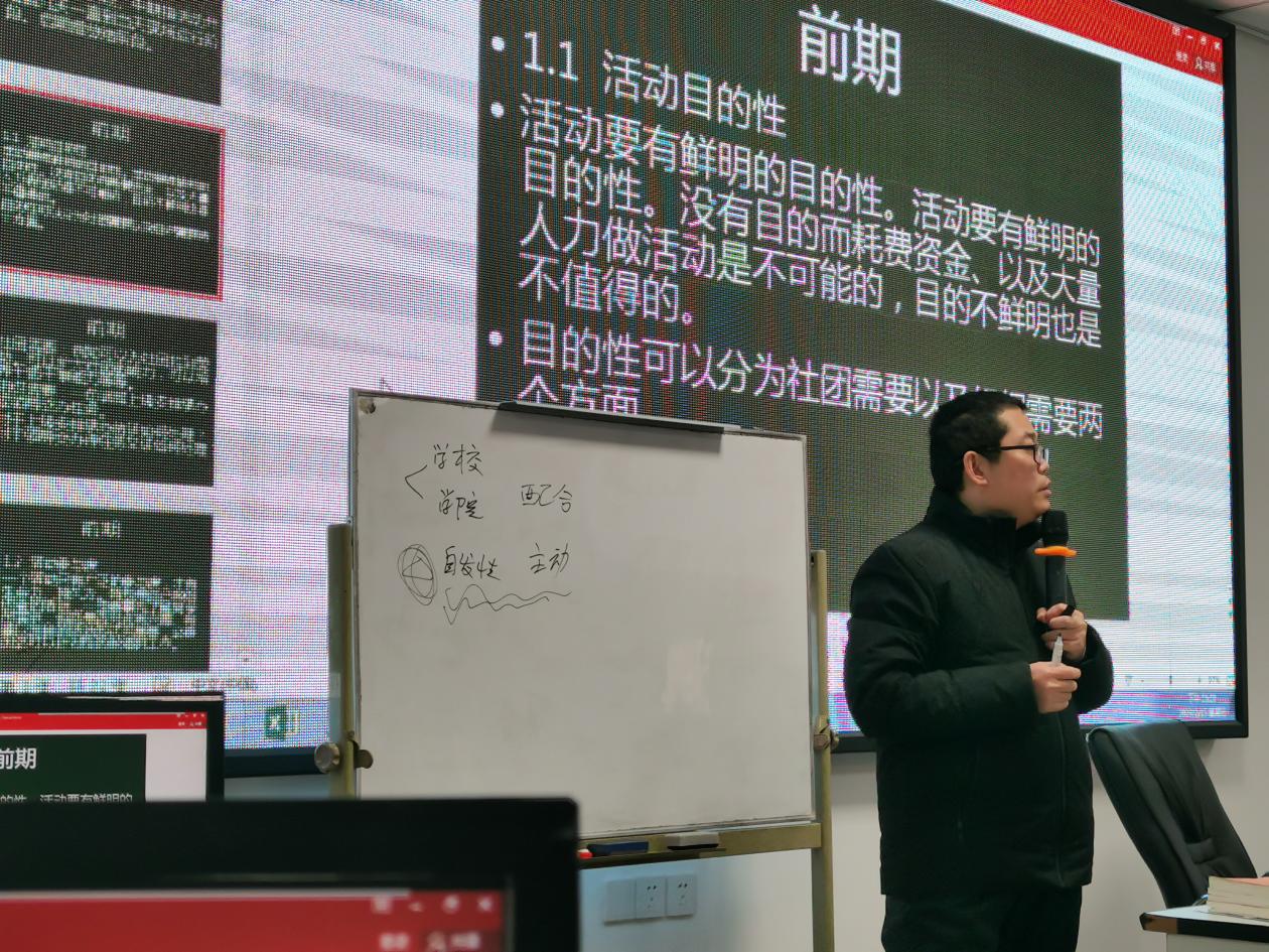 此次培训就开展活动的前期准备、中期工作任务及后期总结宣传三方面展开论述。吴老师就举办学生活动的目的、意义及面向群体展开介绍为什么要组织学生活动;并结合自身经历,针对活动策划的撰写展开详细指导,指出细节的重要性,强调应急方案的必要性、可行性、全面性。接着,吴老师就团队组建和邀请嘉宾工作着重强调,要求全体学生干部明确权责清单,在活动开展前后与领导嘉宾对接工作中,必须专人负责,做到言谈有方、举止有度。最后,吴老师强调,在活动结束后,必须及时做好总结工作,及时做好相关的宣传报道工作。
