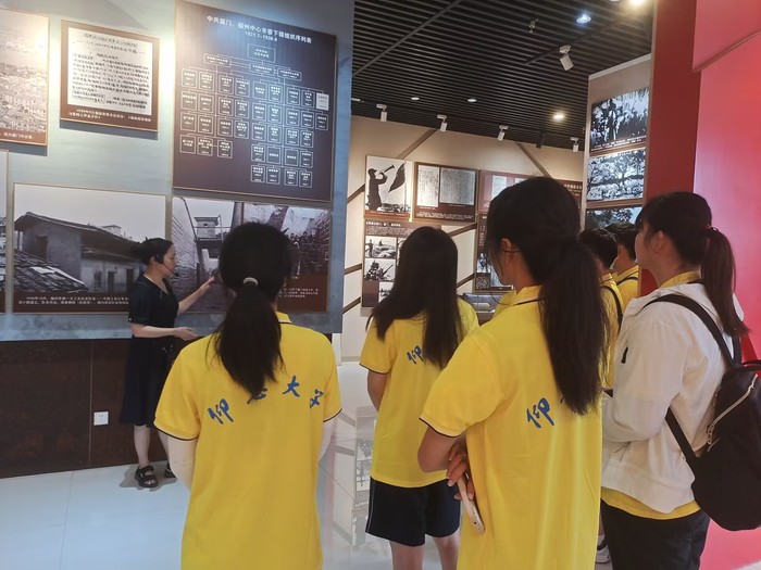 进入纪念馆,映入眼帘的是一座红色的革命纪念碑,上面镶嵌着中共党旗和毛泽东主席的塑像,庄严而庄重。纪念馆的展览馆内充满了历史氛围,进来后可以看到保存完好的旧时办公室、会议场所和其他重要场景。这些场景生动地重现了当时的政治氛围和中共福建省委党组织的工作环境。在展厅的最后一个区域,实践队看到了关于红军长征的展览。这里展示了长征开始前的准备工作,以及红军在长征中所面临的艰难困苦和英勇奋斗的场景。