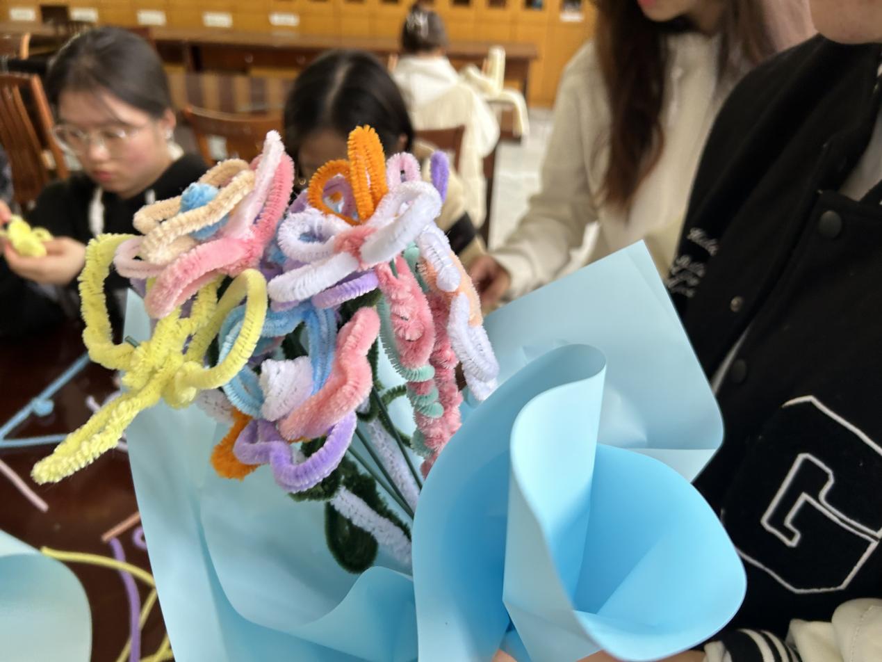 以文化人,以艺通心,支部同学在事先准备好的花束包装纸上进行精心涂鸦,提笔画世界,为“鲜花”制作做铺垫。为进一步贯彻生态环保理念,支部用扭扭棒替代传统鲜花,以别具匠心的手工将朴素的材料变为永不凋零的“鲜花”,并将二者融为一体,形成一束束独具一格的花束。