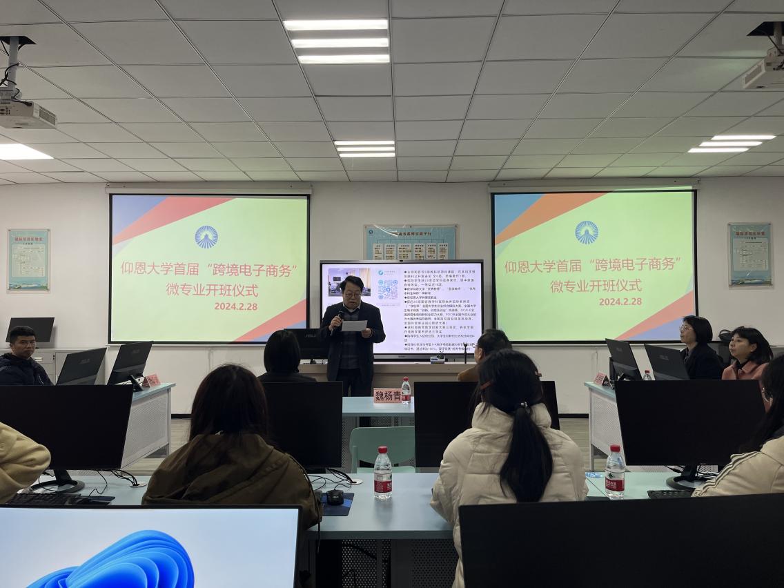 魏杨青在致辞中对首批入选学生表示热烈祝贺,他指出,高等学校的根本任务是培养人才,是培育新质生产力。新一轮本科教育教学审核评估对个性化人才培养模式的建设尤为关注,微专业是学校在“四新”建设背景下,主动适应新技术、新产业、新业态、新模式发展需求,促进学科专业间交叉融合以及推动人才培养改革创新的新探索、新举措。学校非常重视微专业的建设与管理,制定了《beat365官方网站微专业建设管理办法(试行)》(仰大教〔2023〕24号),并依托开课单位beat365官方网站的省级一流专业、一流课程和省级虚拟教研室,不断加强微专业建设中实验实训平台搭建、优质课程开发和教研活动创新。希望同学们珍惜学习机会,潜心实践,圆满完成学习课程,成为新一代复合型跨境电商高级人才。