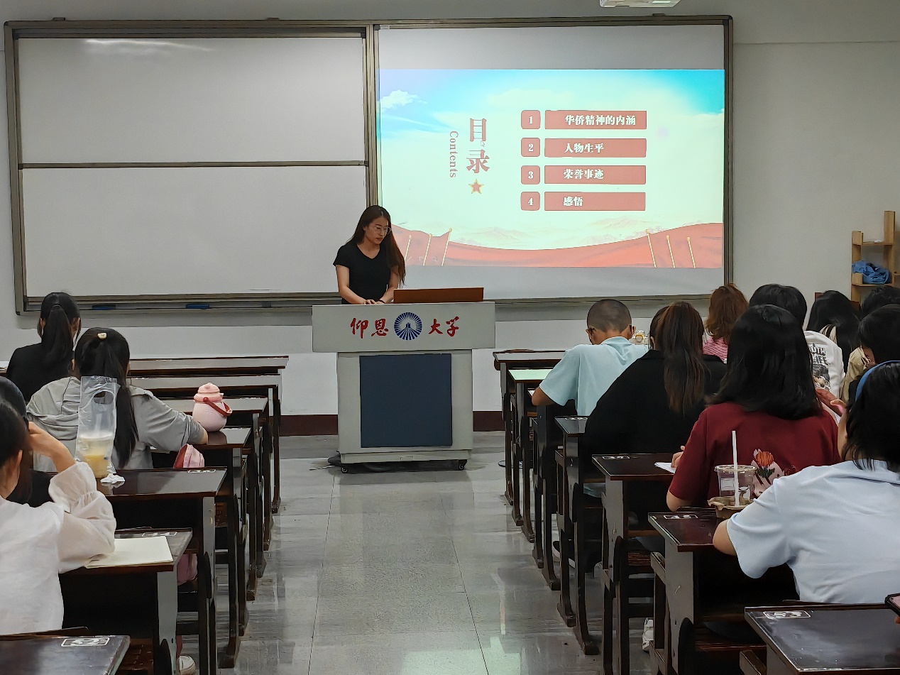 积极分子林丽丽同学介绍了郭永怀、陈嘉庚、吴庆星等老一辈华侨的感人故事,展现了他们作出的卓越贡献,感悟华侨精神。同学们深刻感受到了华侨华人们奋力拼搏、走向世界的艰难创业历程以及对祖国的满腔热爱,见证了华侨华人们自强不息的奋斗精神,心系家国、爱国奉献的精神。