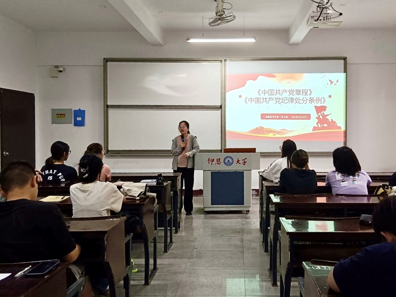在全面从严治党的时代背景下,学习党章党规、纪律处分条例成为广大党员和积极分子的重要任务。2024年5月16日下午4:45,金融系学生第一党支部在仰恩楼A2-105组织集中学习《中国共产党章程》及《中国共产党纪律处分条例》,旨在进一步提高党员队伍建设,增强纪律意识、大局意识。支部书记何丽玲老师与各班积极分子、支部全体党员一同参加了此次学习会。
