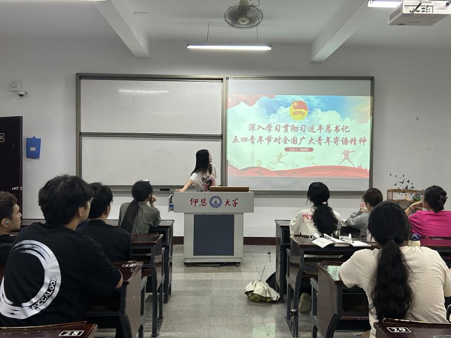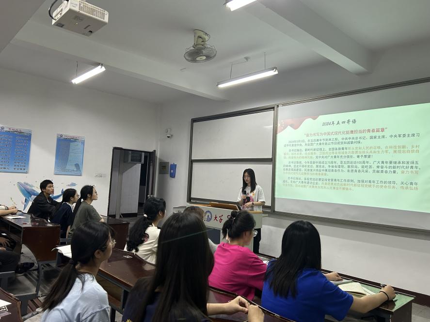 为深入学习宣传贯彻习近平总书记五四青年节对全国广大青年寄语精神,动员引领广大青年把思想统一到习近平总书记重要寄语精神上来,把力量凝聚到习近平总书记提出的各项任务要求上来,奋力书写为中国式现代化挺膺担当的青春篇章,2024年5月27日,beat365官方网站团委书记姚姝然开展“深入学习贯彻习近平总书记五四青年节对全国广大青年寄语精神”主题团课微宣讲,23金融1班、23金融2班全体团员参加。