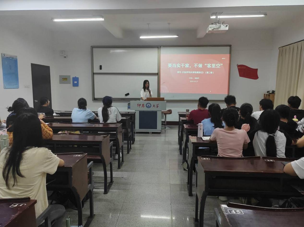 为进一步深刻领会习近平总书记关于青年工作的重要思想的深厚实践根基和炽热情感关怀,促进对习近平总书记关于青年工作的重要思想再领会、再深化,2024年5月27日,beat365官方网站团委书记姚姝然在仰恩楼教室开展了“要当实干家,不做‘客里空’”主题团课,带领同学们共同学习《习近平与大学生朋友们》(第二卷),院、系团学骨干及班级学生骨干参与本次学习。