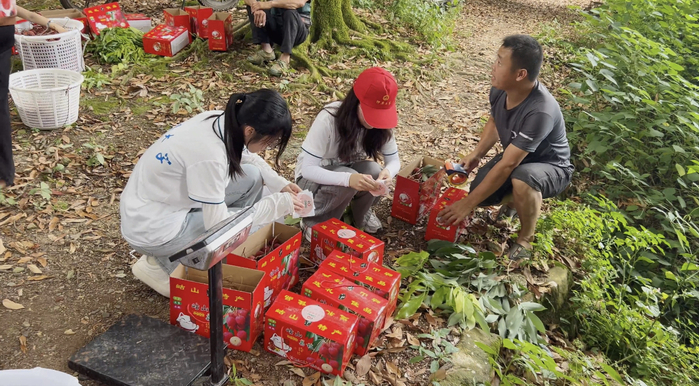 实践队成员们来到了进行直播的荔枝园,开始了直播准备工作。实践队员配合当地果农布置直播场地和调试设备,确保直播过程顺利进行。随着直播的开始,主播为直播间观众们介绍了荔枝的品种、口感和营养价值以及岵山镇种植荔枝的优势。直播中,果农们还现场采摘荔枝,并让实践队员现场品尝。为了增强活动的吸引力,主办方还设置了多个互动环节,包括在线抽奖、优惠促销等,激发观众参与积极性,提高直播的参与度和转化率。这些活动不仅激发了消费者的购买热情,也有效扩大了岵山荔枝的市场影响力。