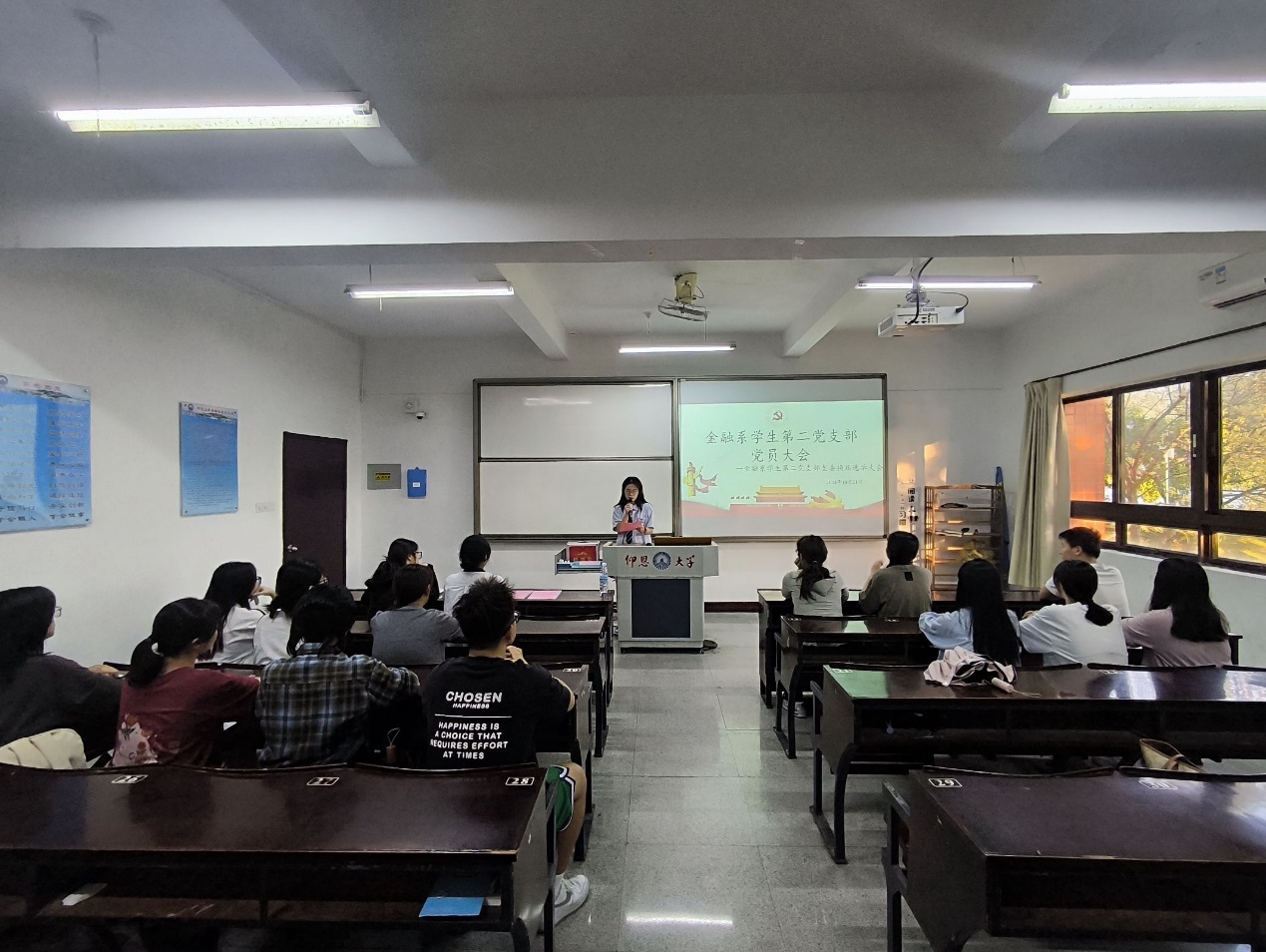 大会第三项,选举新一届支部委员会委员。经学院党委批准,金融系学生第二党支部委员会由3人组成,确定候选人4名。首先,姚姝然宣读支部委员会候选人名单:马乾豪、文铖宇、洪泳淇、黄杨婷,并进行简单介绍各位候选人的基本情况。根据无记名投票方式进行一轮投票,监票人和计票人计票,收回选票数和应收选票数一致。随后,由姚姝然宣读选举结果报告单,根据此次选举办法和计票结果,文铖宇、洪泳淇、黄杨婷3位同志得赞成票超过实到会有选举权的党员人数的半数,当选为金融系学生第二党支部新一届支部委员会委员。