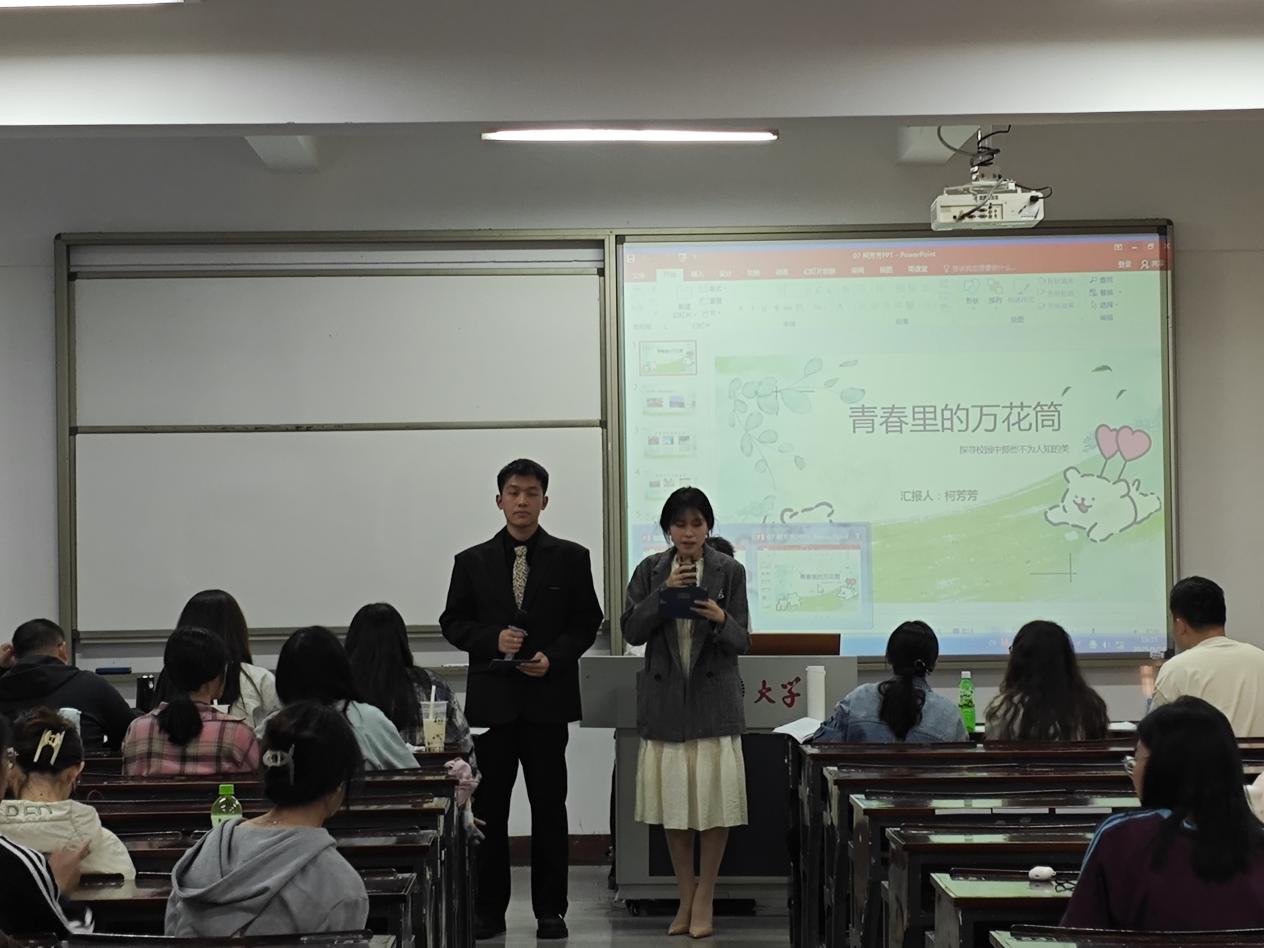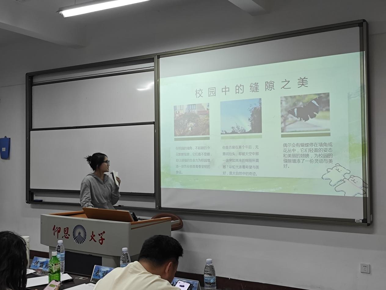 活动在主持人的诗意对白中拉开帷幕。“春潮涌动书声琅,镜湖波漾映韶光;杏雨纷飞墨香浓,桃李争妍绘锦章”,以古典诗词为引,将现场观众带入青春与艺术交融的氛围中。此次活动以学院团委书记姚姝然老师的日常Vlog《仰大一日》引入展开,以数字形式定格校园生活的平凡瞬间。她表示:“每一帧画面都是时光的馈赠,希望同学们珍惜当下,用镜头留住青春的温度。”随后参赛选手们依次上台展示并介绍Vlog作品,他们用独特的视角和创意的剪辑,带领观众们走进他们的校园生活。从图书馆的静谧到操场的活力,从课堂的专注到宿舍的温馨,每一个画面都充满了青春的气息,分享创作背后的故事和感悟。