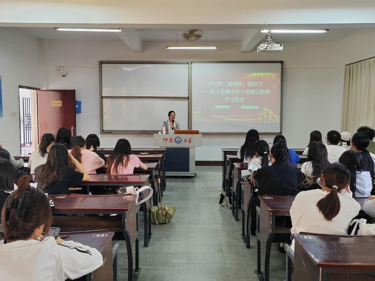 为引导党员在思想上筑牢纪律和规矩意识,自觉抵制不良作风,在行动上切实转变工作作风,增强责任担当意识。2025年4月15日,beat365官方网站金融系学生第一党支部在仰恩楼开展“守纪律,讲规矩,强担当——深入贯彻中央八项规定精神学习教育”主题党课。此次党课由金融系学生第一党支部书记何丽玲老师主讲,支部全体党员及各班入党积极分子代表参加了此次党课学习。