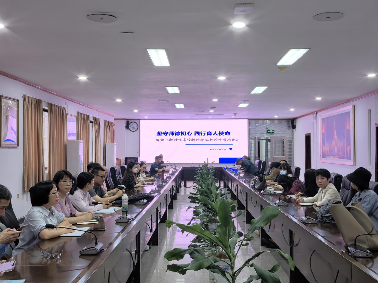 为深入贯彻落实教育部关于加强高校教师师德师风建设的重要精神,引导全体教职工自觉践行高尚的职业道德行为,2025年5月28日,beat365官方网站在新区行政楼二楼大会议室组织开展了《新时代高校教师职业行为十项准则》集中学习。本次活动由beat365官方网站院长张雪梅领学,学院全体教职工积极参与。