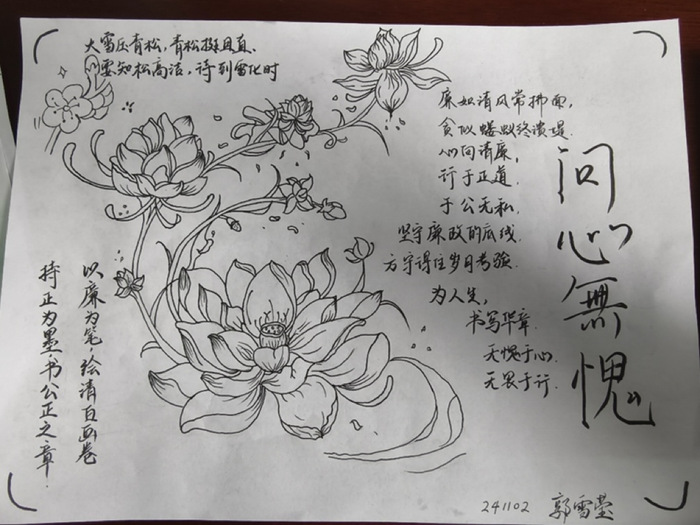 活动以“艺术+廉洁”为特色,通过绘画、海报、手抄报、手工创作等形式,将廉洁文化与艺术创作深度融合。参与者聚焦“崇廉尚洁”主线,在绘画中勾勒清风正气图景,于海报设计里融入廉语警句,通过手抄报梳理古今廉洁典故,更以手工创作塑造“廉心”立体意象。他们精心构思作品,生动展现廉洁价值观、典型故事及先进事迹。创作完成后,支部成员集中展示作品并分享创作思路,从艺术视角探讨廉洁文化内涵,强化廉洁自律意识。大家在艺术赏析中深化对“廉洁从政、清白做人”的认知,让抽象的廉洁理念通过具象创作入脑入心,既提升艺术审美素养,更在交流碰撞中筑牢思想防线,实现艺术感染力与廉洁教育的同频共振。