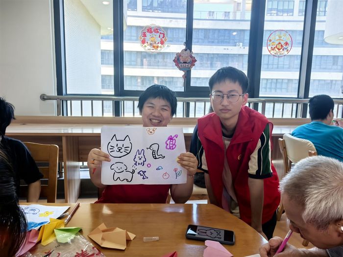 随着折纸活动的展开,从简单的纸飞机到稍复杂的爱心造型,老人们学得格外认真,现场气氛温馨而欢乐。紧接着开展的绘画活动将此次互动推向高潮。队员们为老人们提供了画纸和彩笔,鼓励他们尽情发挥想象,描绘心中的美好画面。一幅幅色彩丰富、饱含情感的画作不仅展现了老人们对生活的热爱,更记录下了这段珍贵的时光。