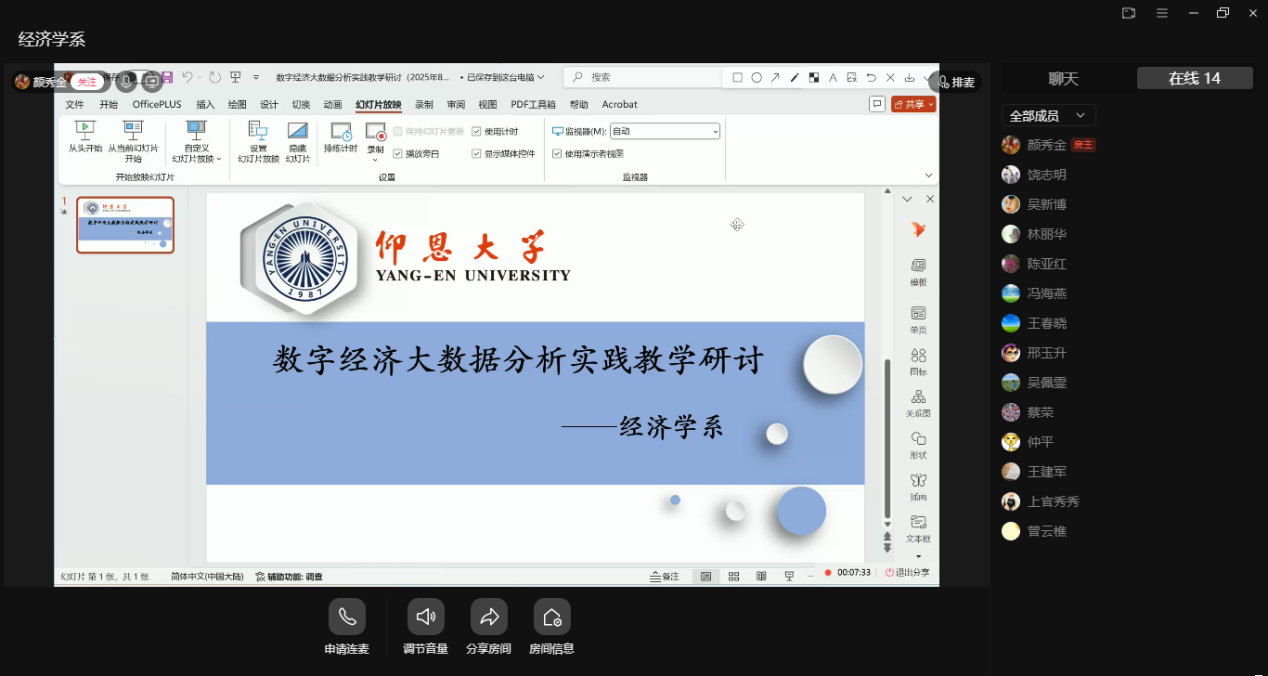 8月4日,经济学系举办了数字经济大数据分析实践教学线上研讨会活动,围绕数字时代经济学人才的培养模式与实践教学路径进行了深入探讨与交流。首先,经济学系主任颜秀金强调,数字经济正深刻重塑全球经济格局,对经济学人才培养提出了全新挑战与更高要求。传统的经济学教学必须与时俱进,将大数据分析、人工智能、平台经济等前沿领域的最新实践融入教学过程,培养学生的数字化思维和解决现实复杂问题的能力。吴新博教授从产业视角出发,分析了当前市场对数字经济领域人才的迫切需求,强调了实践能力、数据分析工具运用能力及跨界融合能力的重要性。在专题讨论环节,教师就“数字经济课程体系构建”、“虚拟仿真实验教学项目设计”等关键议题展开了热烈讨论,并就实践中遇到的困难与解决方案交换了意见。