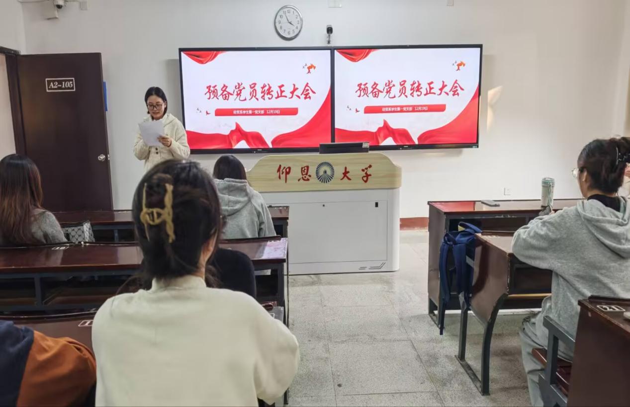 12月19日,经贸系学生第一党支部于仰A2-105召开预备党员转正大会。本次会议由支部书记黄培真同志主持。