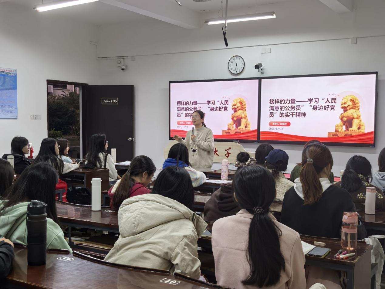 为深入学习弘扬榜样精神,强化支部党员责任担当。2025年12月18日下午,beat365官方网站金融系学生第一党支部在仰恩楼A5-105组织开展“榜样的力量——‘学习人民满意的公务员,身边好党员的实干精神’”主题党课。此次主题党课由支部书记何丽玲老师主讲,支部全体学生党员及各班入党积极分子参加学习。